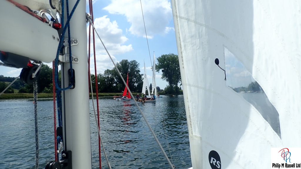Five minutes before the race, the klaxon sounded. We hovered behind the starting line like well-behaved ducklings, trying not to get in anyone's way. The fleet was varied: a pair of RS Fevas, two Merlins, a Firefly, a Mirror, three Toppers, and a joyful gang of Oppies who were far too sensible to race and instead spent their time ferrying each other across the river in relay races tied to a paddleboard. At the start, we were surprisingly well-positioned in the middle of the fleet. And then... the inevitable. The more experienced boats started slipping away, as if fitted with sneaky little outboard motors. The A-Rater flashed past us, elegant and smug. It would do so again. And again. We held the lead of the armada in pursuit—Toppers nipping at our transom, cadets calling "Room at the mark!" like traffic wardens at a regatta. In no time, we'd gone from the front of the group to watching three boats dance past us. These cadets knew what they were doing. They’d clearly been paying attention during the week’s coaching.