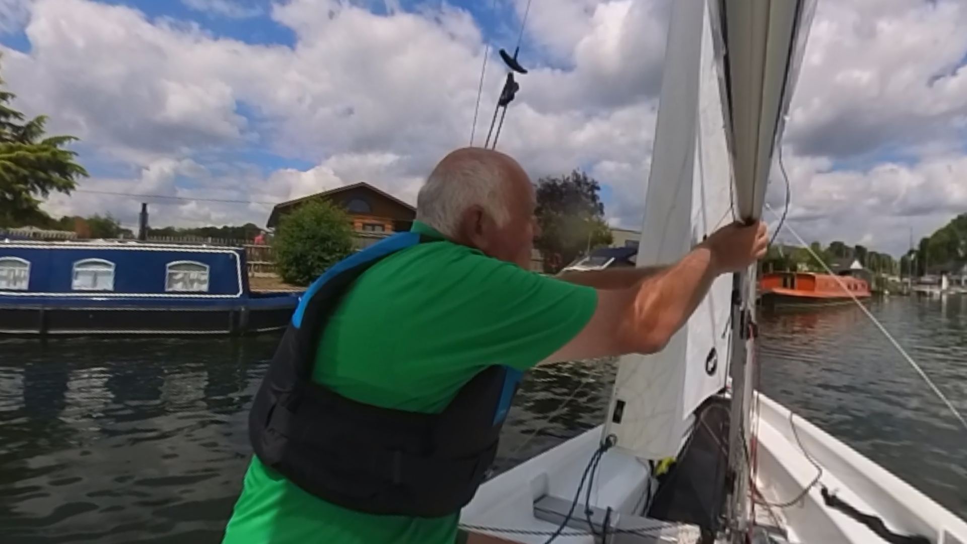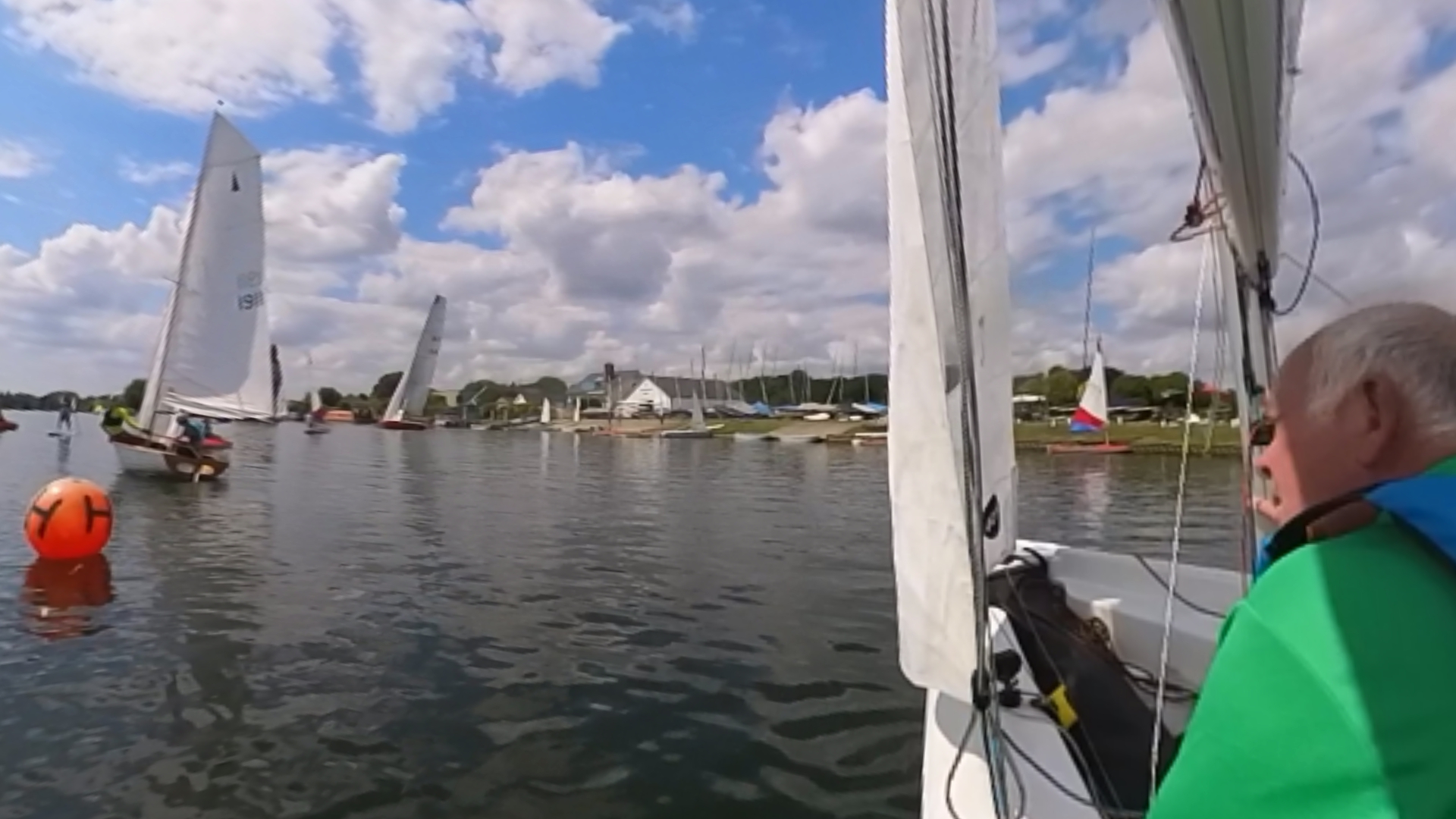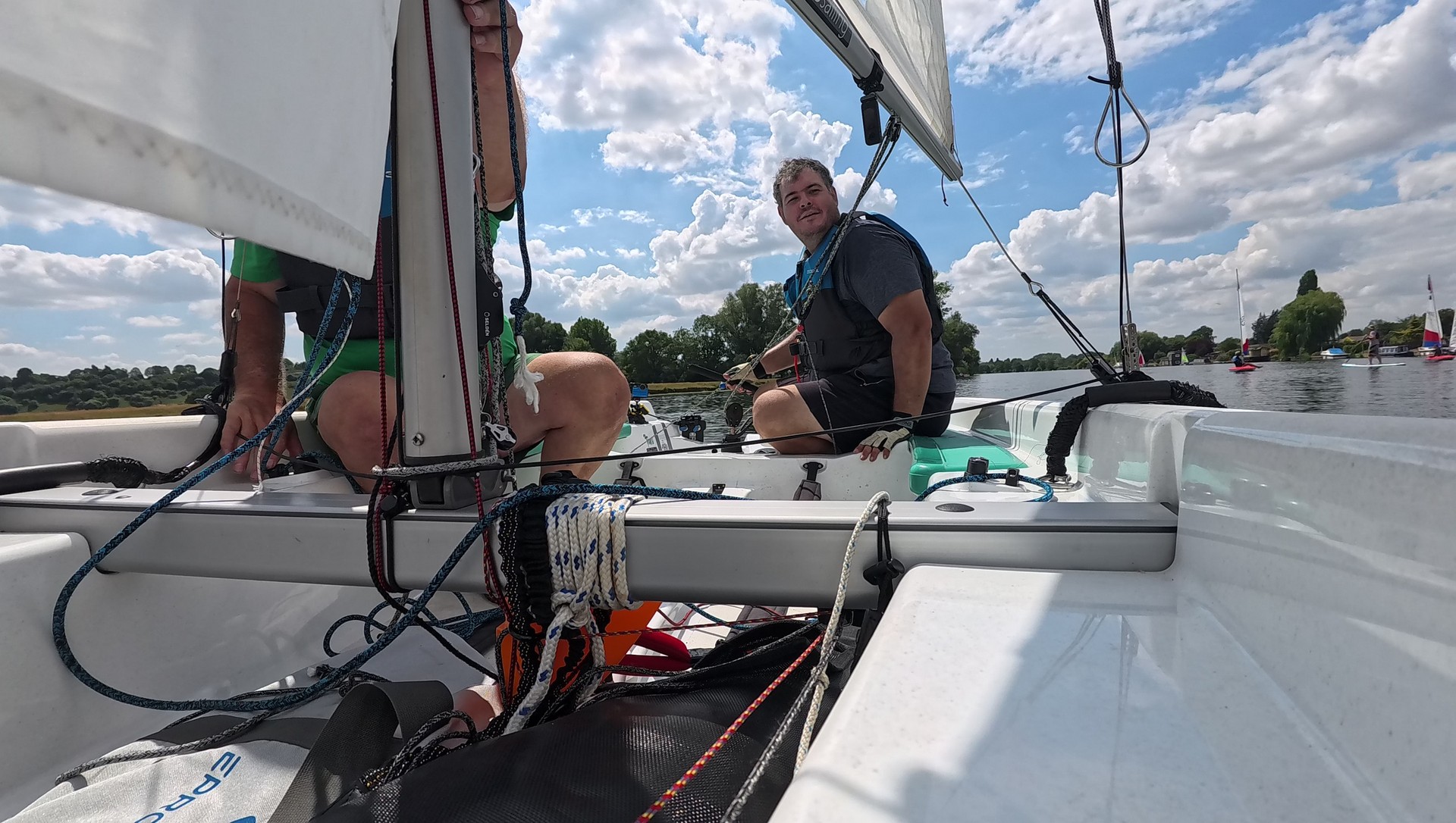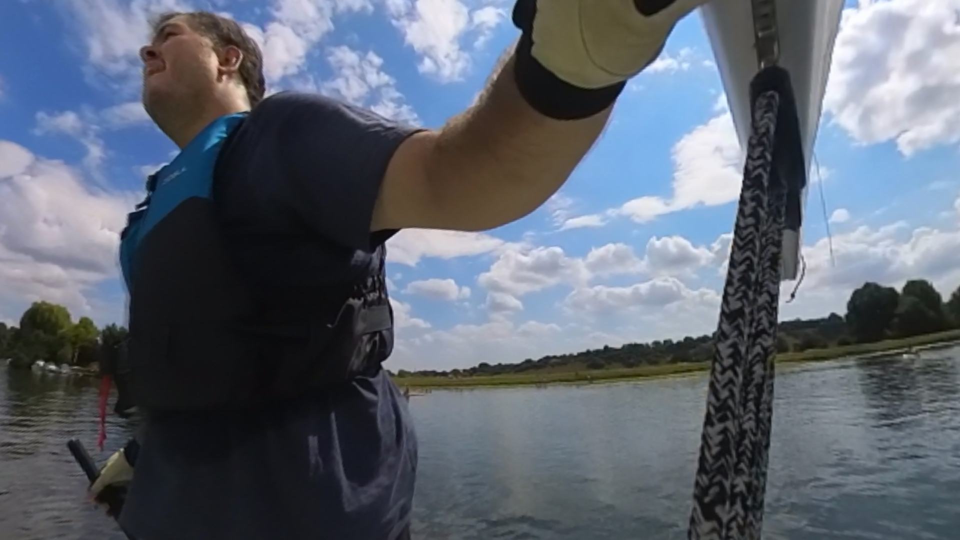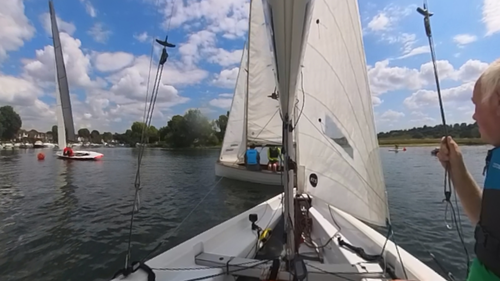 The race was set at six laps. By lap two, we were already nearly last. But we were holding our own against the Toppers, which felt like a small win. As we followed a Merlin into a mark, they swooped in, turned on a sixpence, and zipped away like a startled trout. We followed close behind… and stalled. Paul wrestled with the sails and rudder, while I sat trying to stay calm, waiting for the jib to cross over. I’ve been told off before for being too impatient and backing the jib, so this time I waited like a saint. A very slow, slightly annoyed saint. Eventually, the boat turned, picked up speed… but the Merlin was already 50 metres ahead and probably laughing.