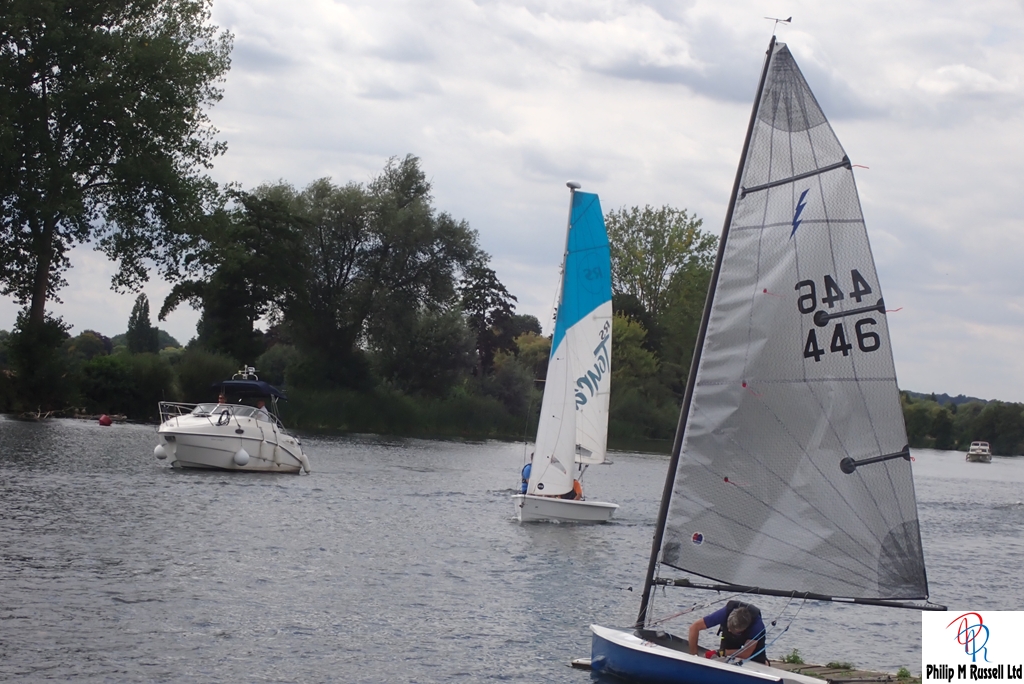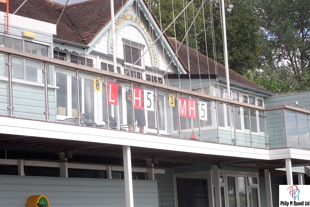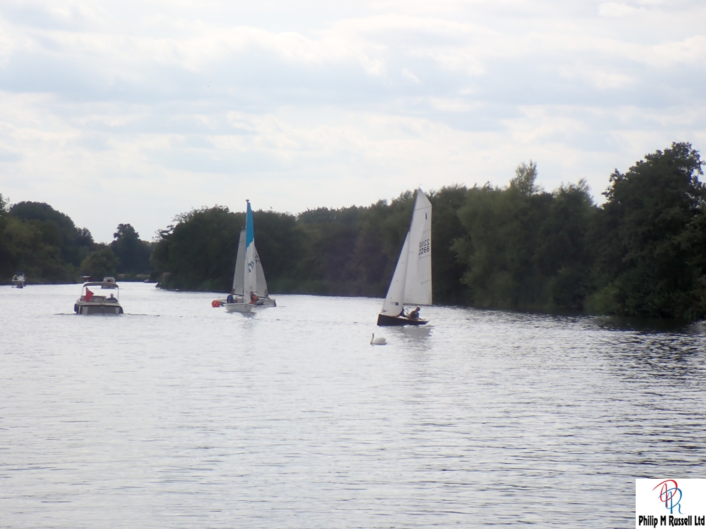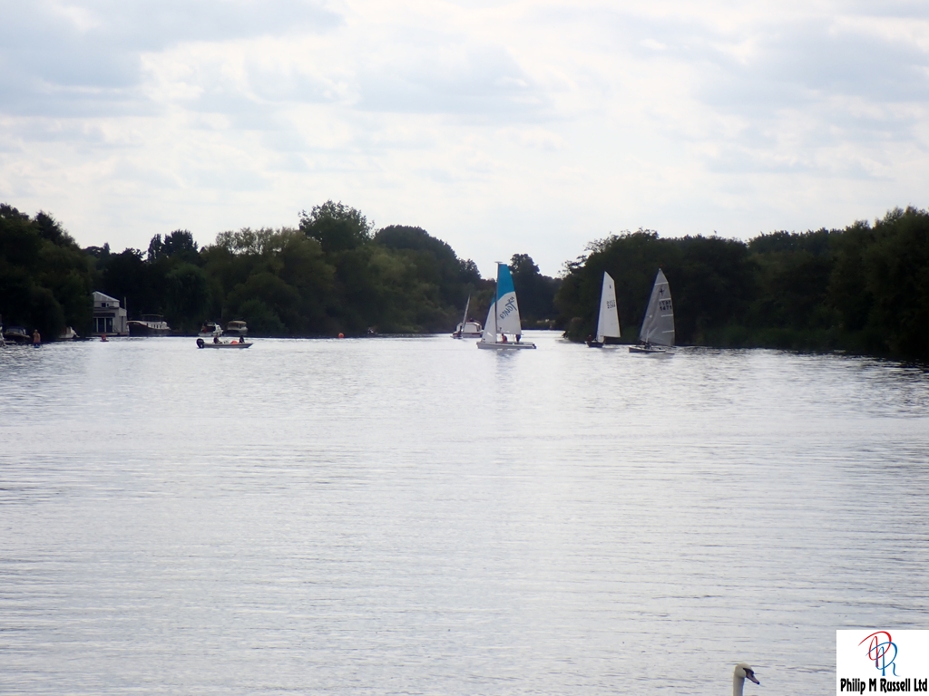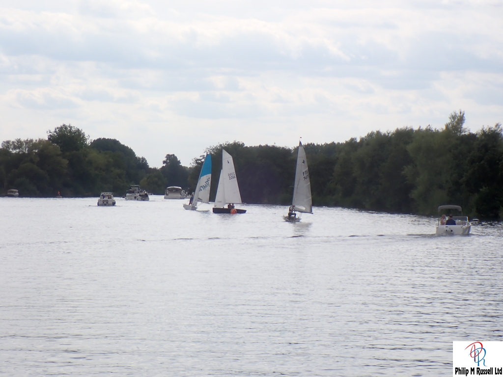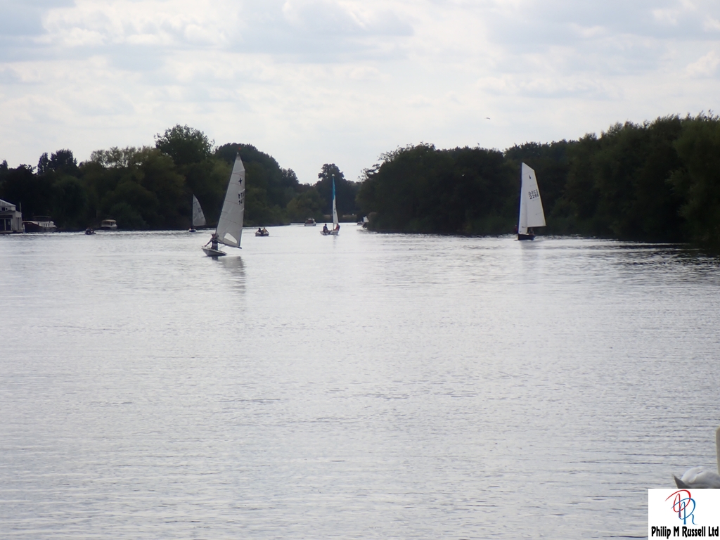 We practised our start on the five minute warning. The Wind was quite good blowing across the river, so we could sail up and down the river on the same tack. The one minute horn sounded. As if on cue, the wind, which had been doing a passable impression of “light breeze,” decided it had better things to do. Like not be here.