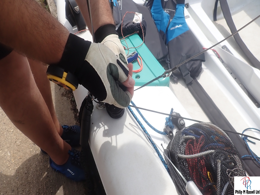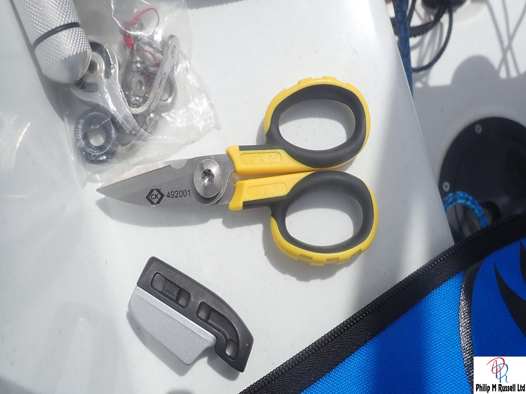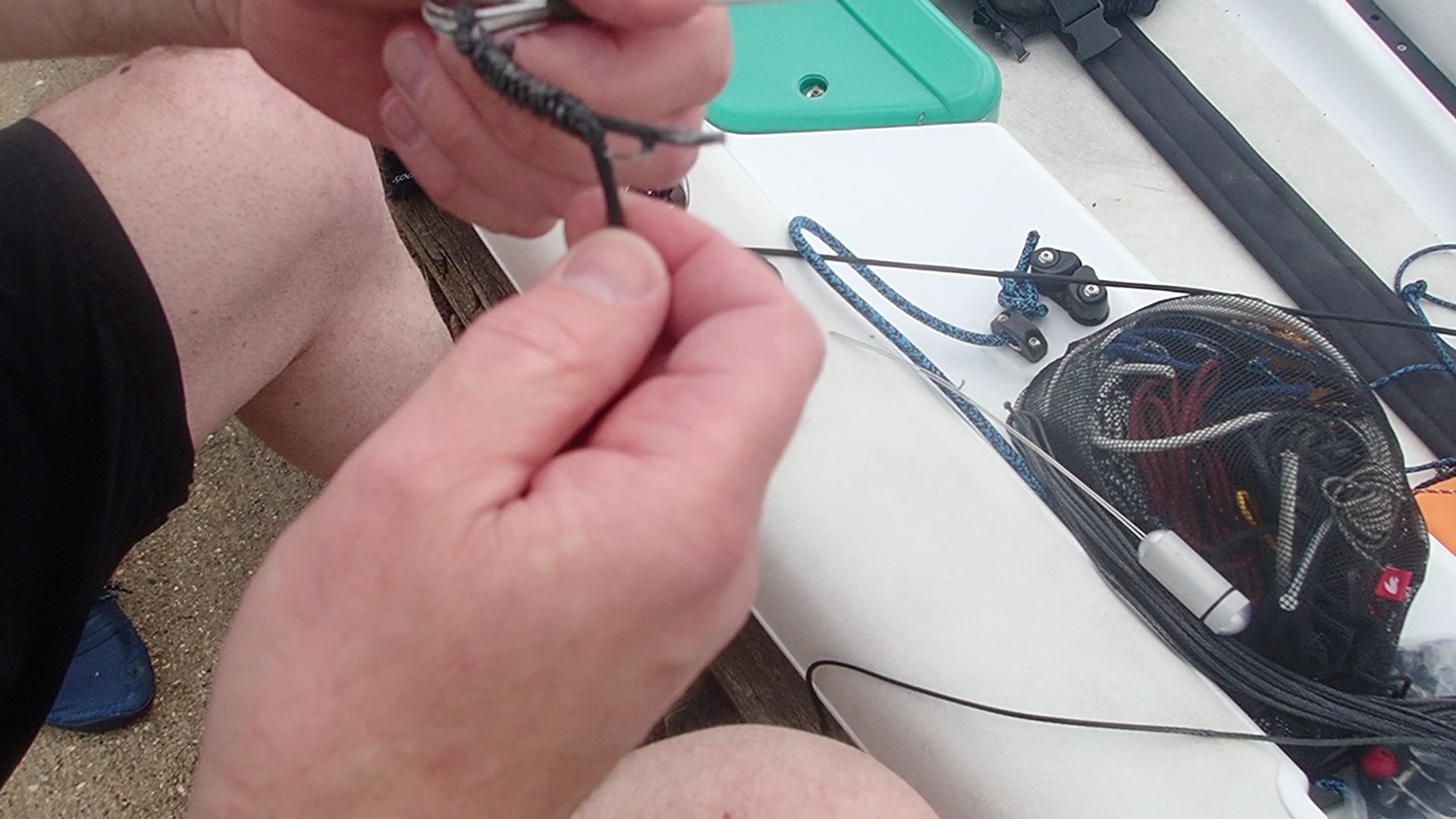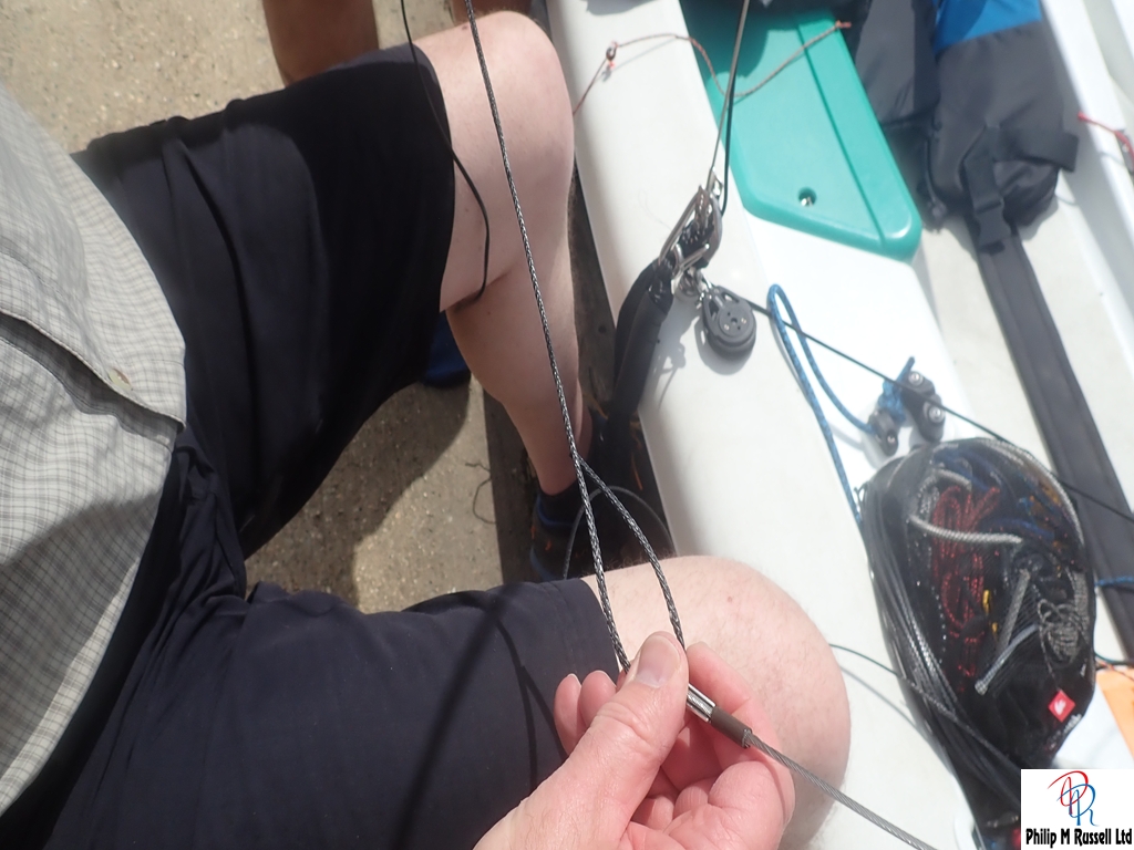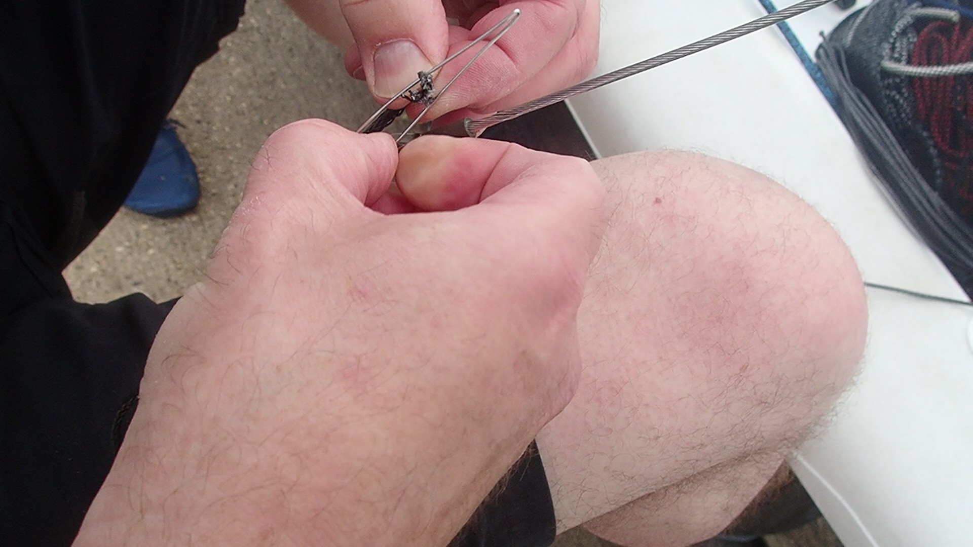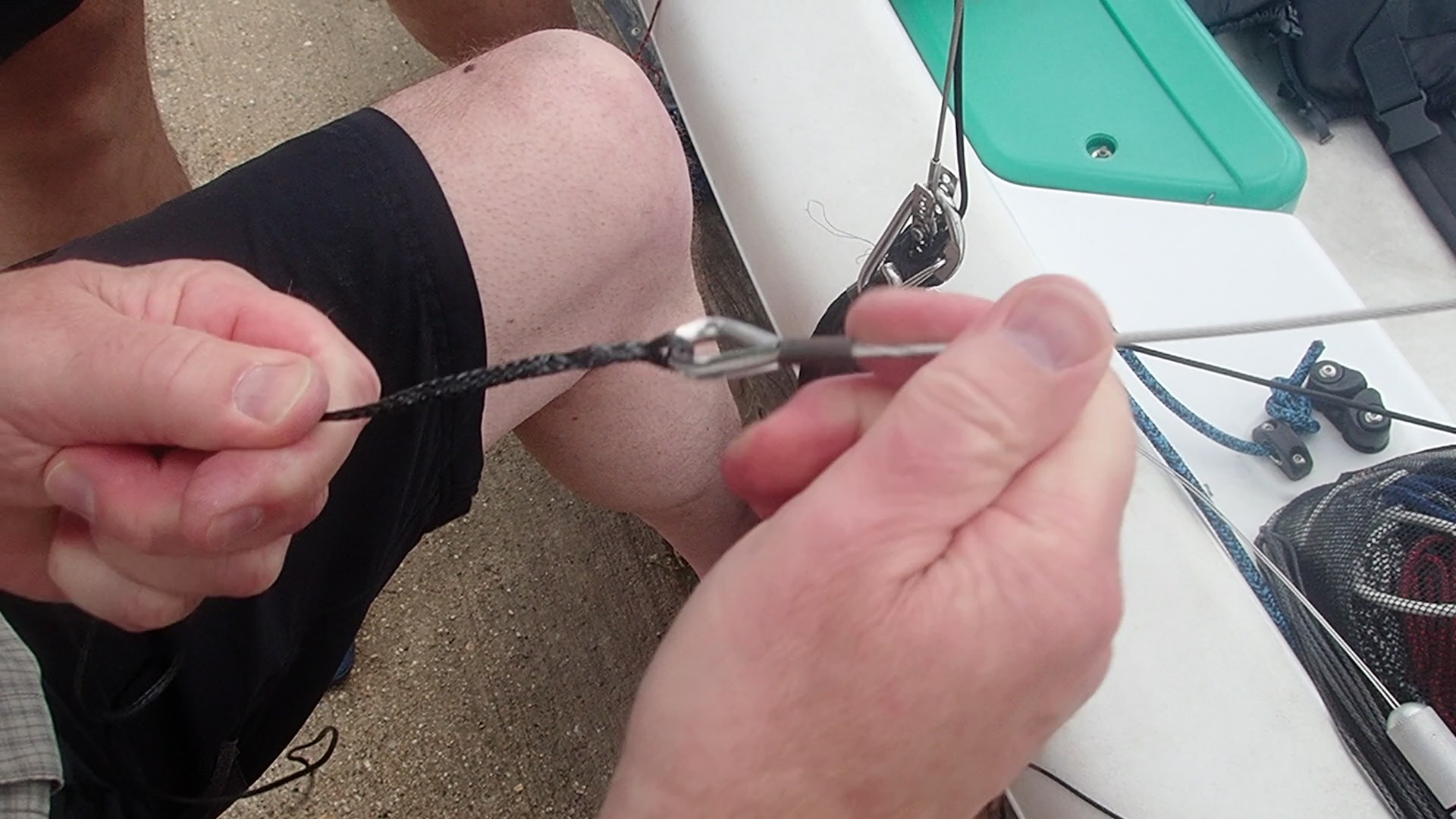 The simple answer was that you don't and Alistair took a good deal of time to teach me how to splice the Dyneema rope with a splicing kit and special electrical scissors to cut the rope. The result was a perfect fit and nearly as strong as the steel braid. Read about Learning How to Splice