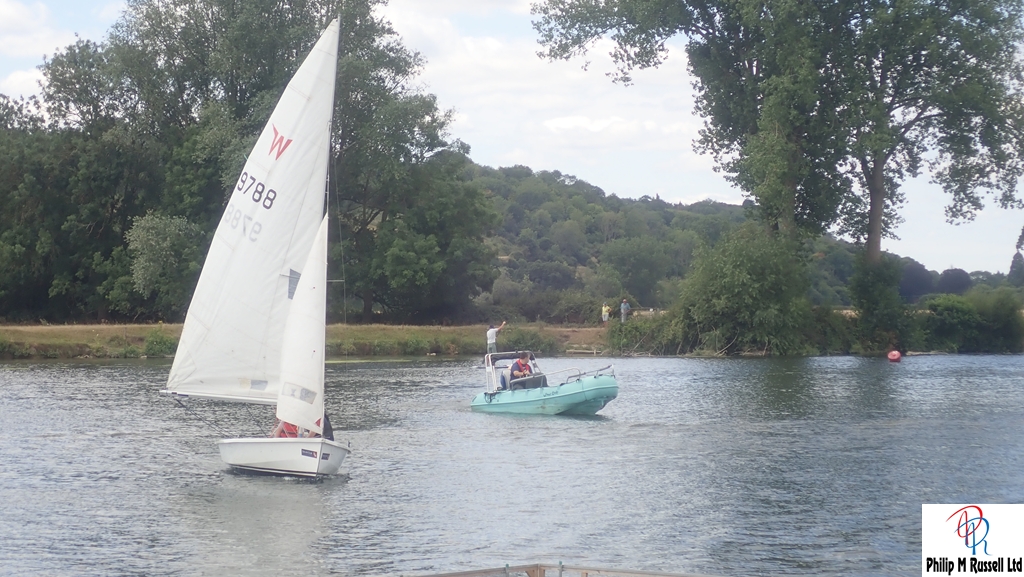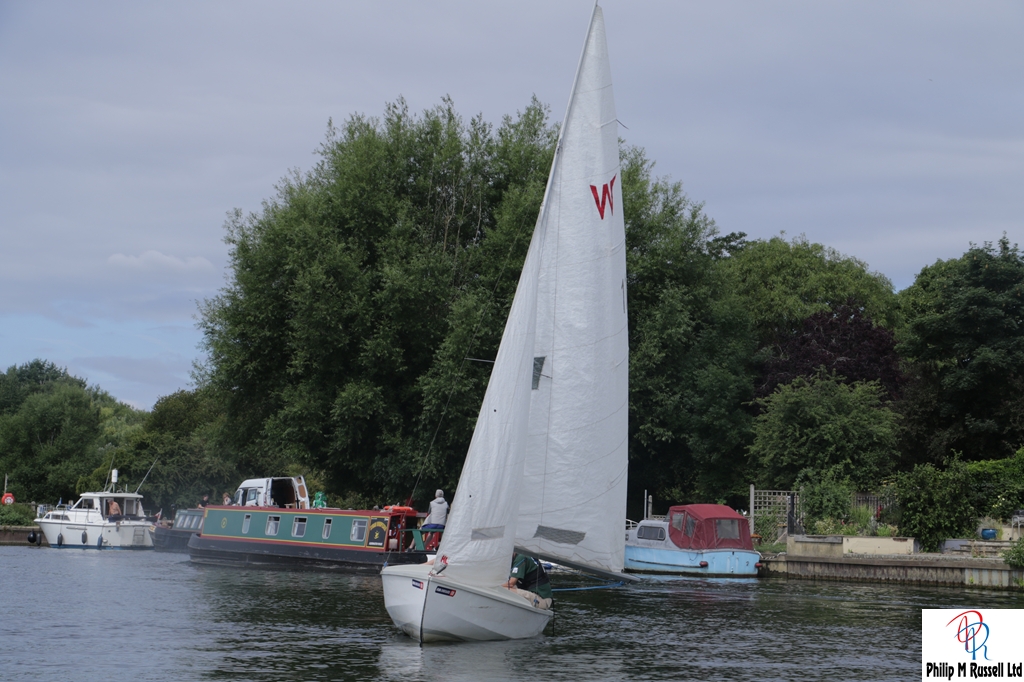 The wind stayed steady and manageable, and everyone got in some solid practice. A new member, Peter, turned up to investigate what “Wednesdays on the Water” was all about and was soon swept up into the excitement—though I suspect he hadn’t anticipated quite so much drama on his first visit. Just as Peter was getting the lowdown on our river antics, Philip called it a day, and we motored over to help bring him and John’s Zests ashore. As I helped them retrieve their boats, Alex and Nick found themselves stranded on the opposite bank. Paul bravely set off solo in the Whaly to assist, but by the time he arrived, a heroic passerby had already rolled up his trousers, waded in up to his knees, and shoved the Wayfarer back into the stream. Unfortunately, Alex’s attempt at steering didn’t quite stick the landing, and the boat returned like a boomerang. So our riverside hero gave it another go—this time wetter but wiser—and successfully got them moving again.