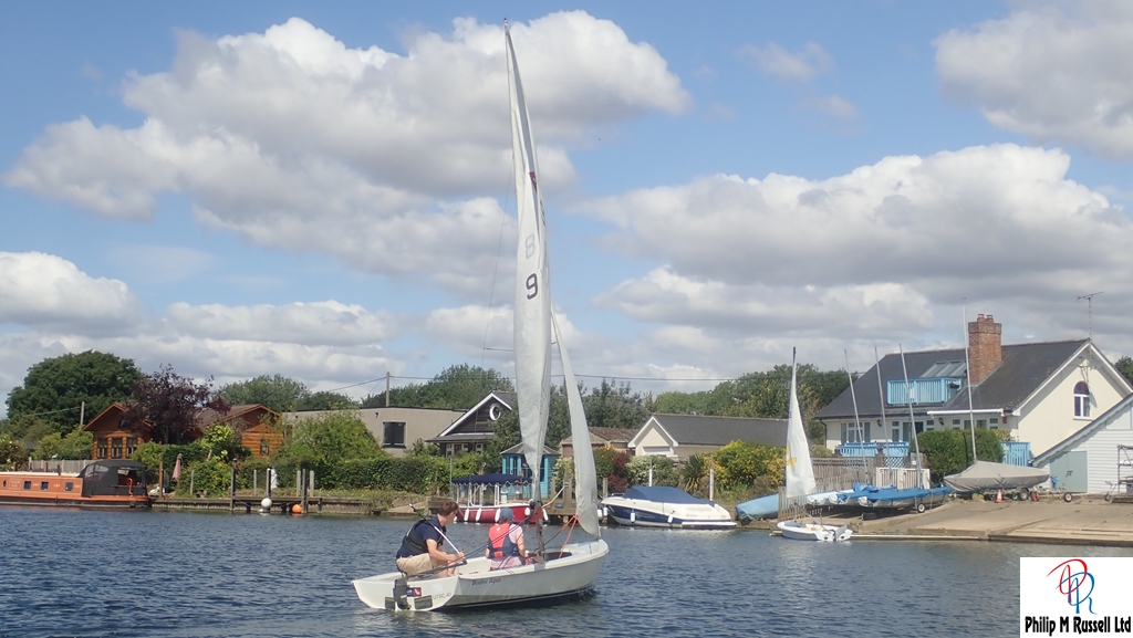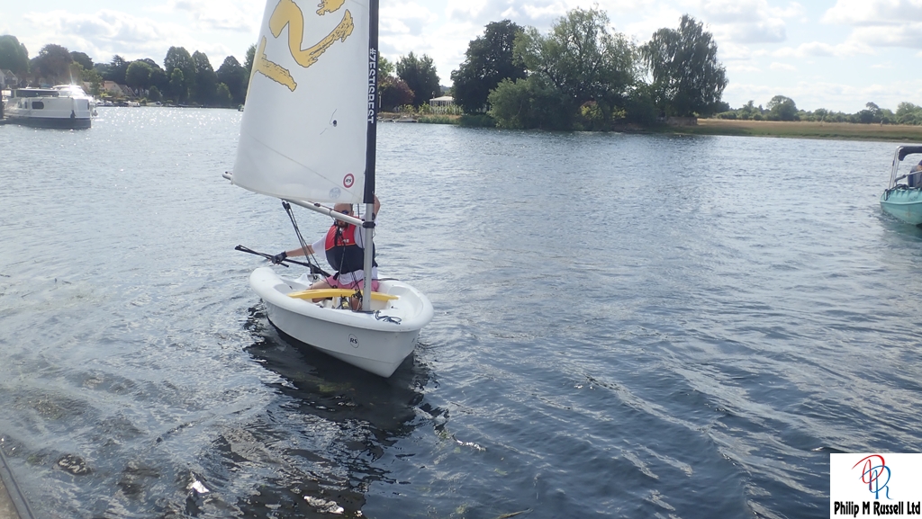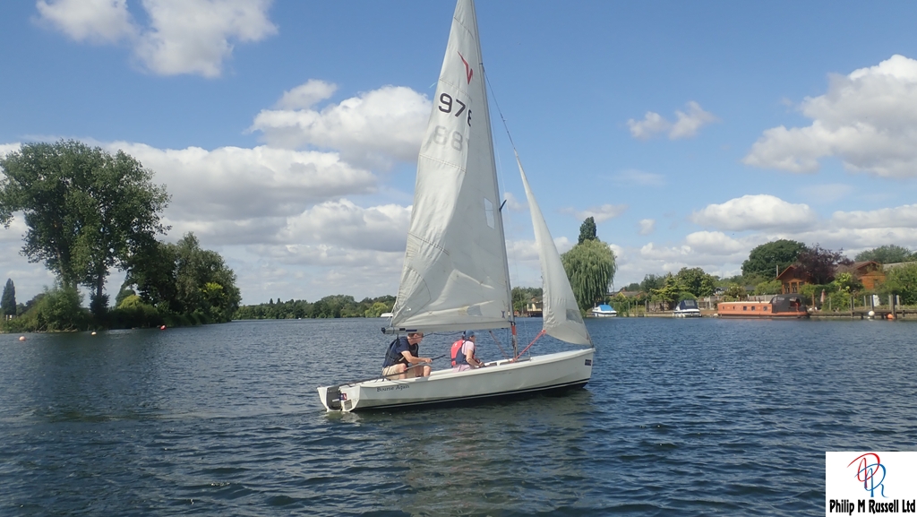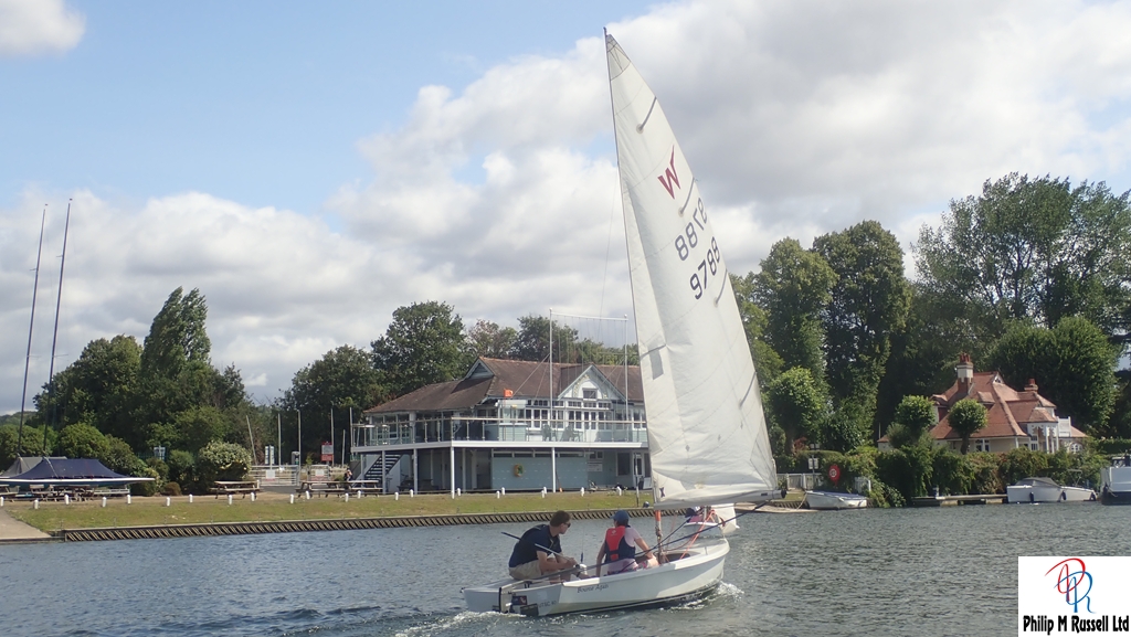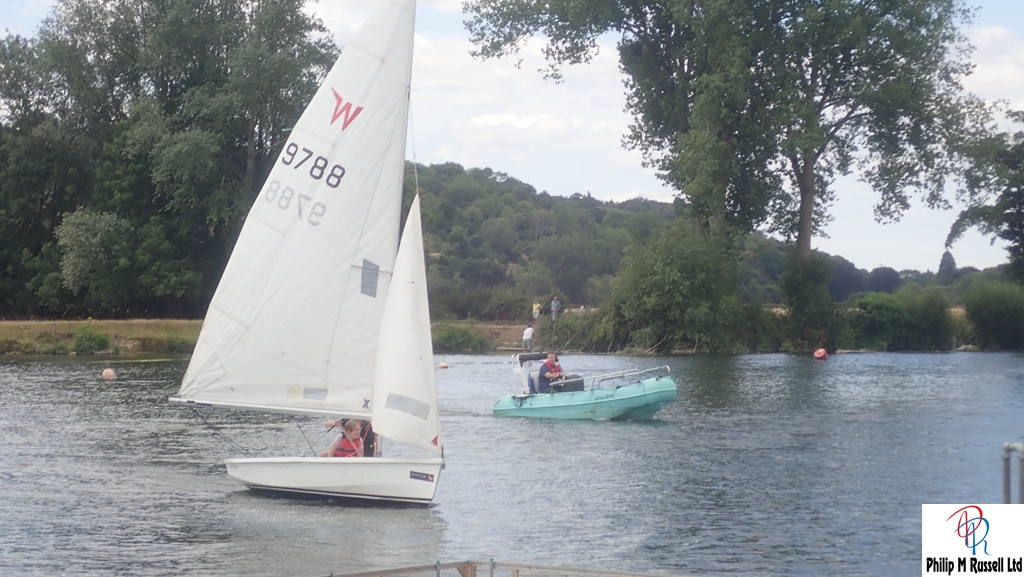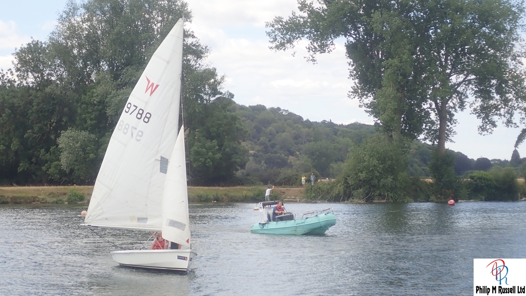 Then came the boom. Literally. It swung across and gave Philip a whack to the head via the mainsheet pulleys. A minor cut, a bit of blood, but Philip was undeterred—and astonishingly cheerful. We followed him closely in the safety boat as he regained his confidence, choosing (with some persuasion) to tack rather than gybe every time. Soon he was confidently zipping from bank to bank like a seasoned sailor. Meanwhile, Nick and Alex launched the Wayfarer—or tried to. Within moments, they were hauling it back out of the water. Why? Because it was rapidly becoming a submarine. Someone (who shall remain nameless) had forgotten the bung. Take two was far more successful, and soon they were gliding up and down the river like nothing had happened. John, sensibly, decided to join us in the Whaly rather than tempt fate with a third Zest.