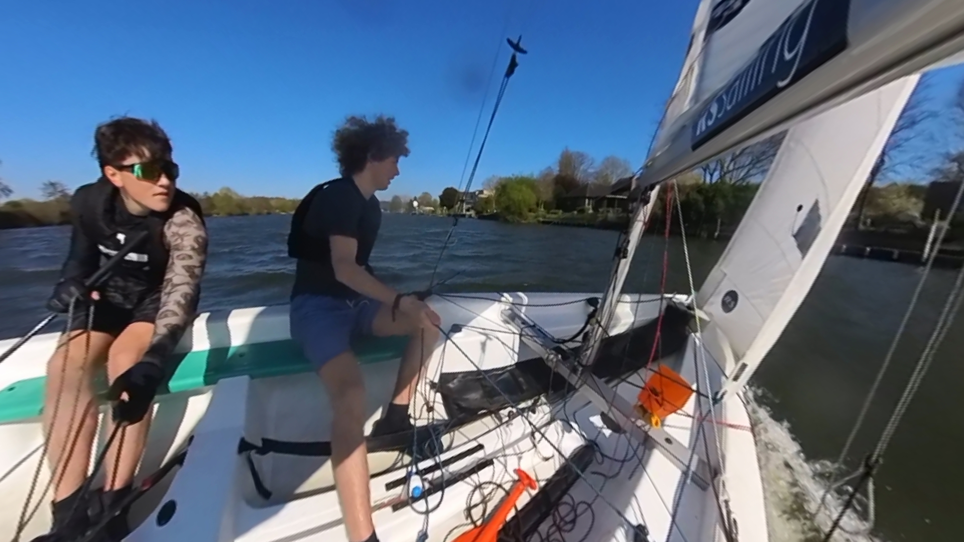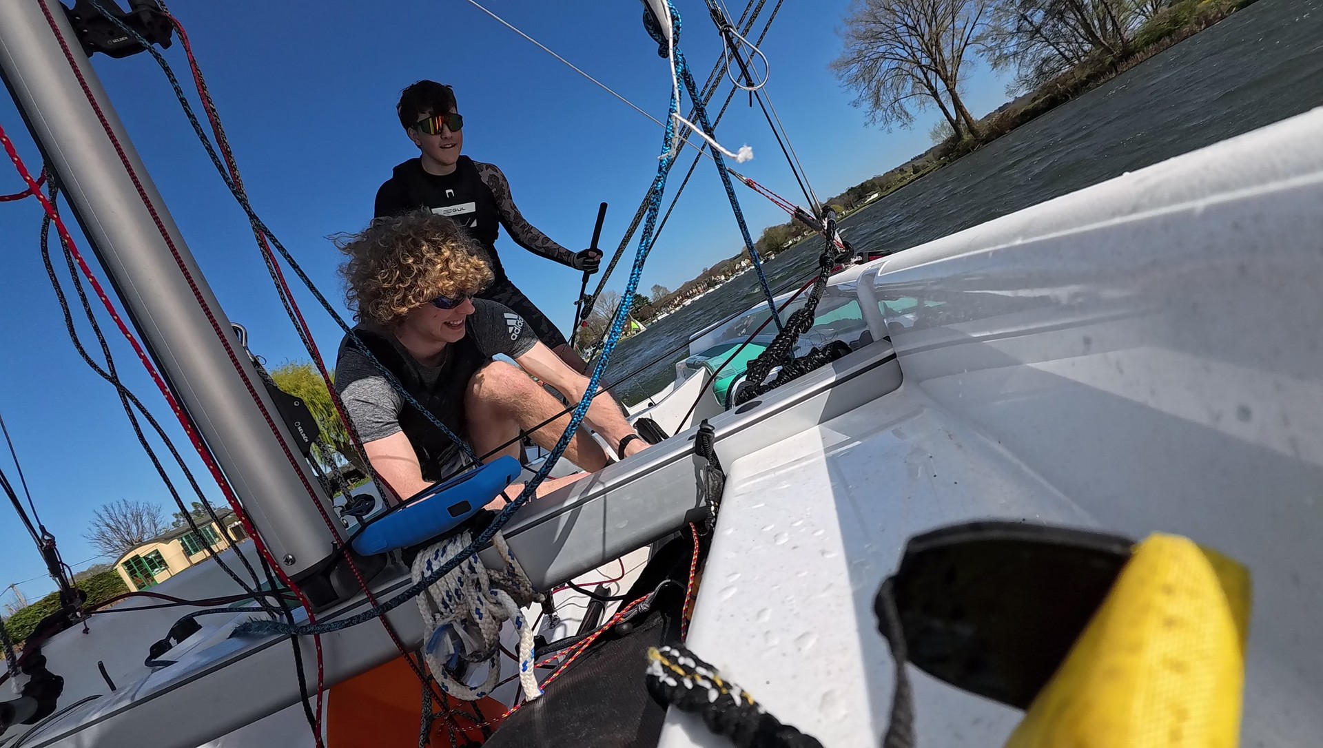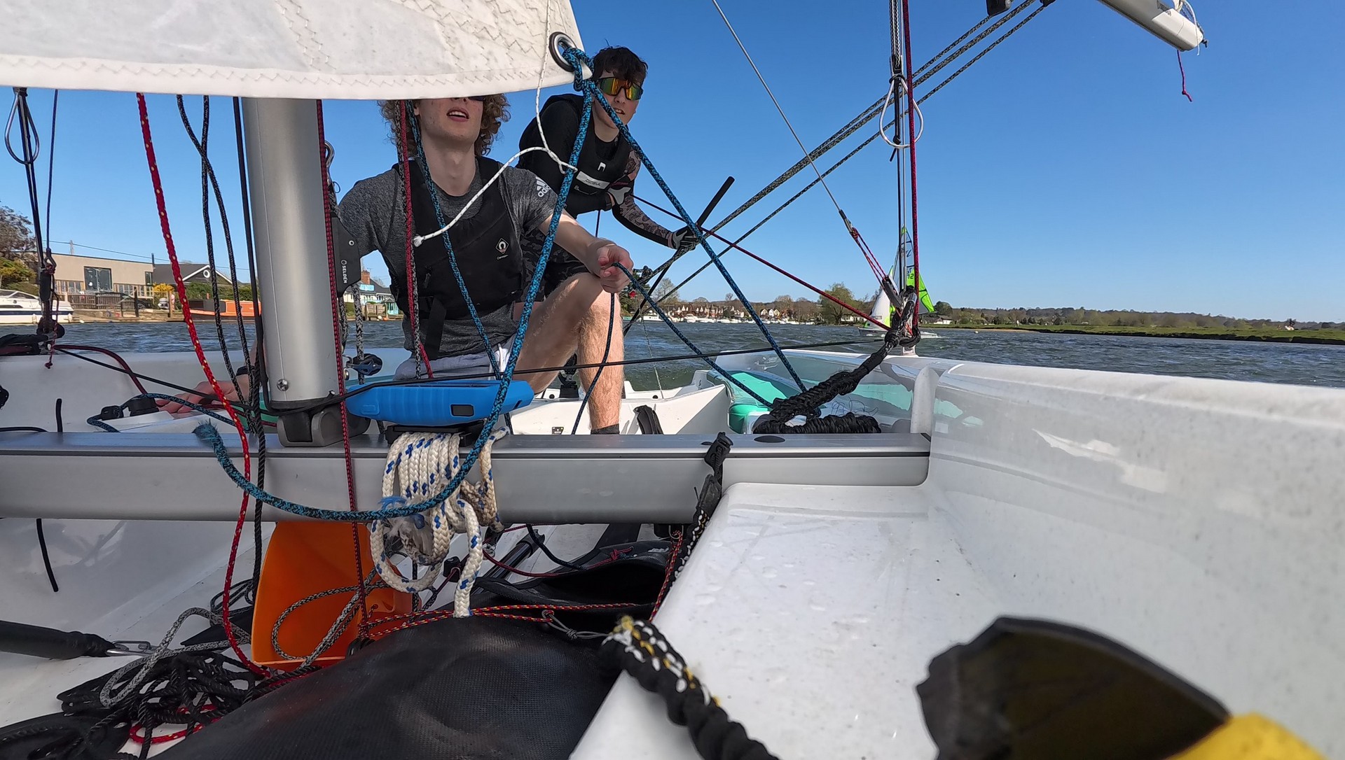 Dan noticed we had a spinnaker and was keen to deploy it in these gusty conditions. We hadn't used the spinnaker and the only time we had used it was on dry land on a RYA1 course when we were looking at the different types of sail. The sail did not deploy well and so the boys moored on a private jetty with the owners laughing at them fixing the sail.. Once fixed they sailed up the river at speed.