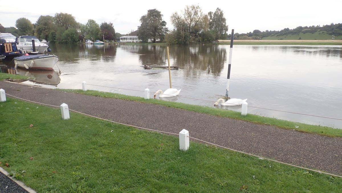 A Sunday Call. Move the club boats. The club boats were queued to get across the railway line to Sin City, which will be above the possible flood line when the River Thames floods even higher this Autumn, Winter and Spring. It is unlikely that there will be much more sailing this year. A good number of members turned up so many hands made lighter work. The push up the the railway line was still as hard, but with several pushing and pulling it was easier. Thje only ones happy seem to be the swans who could swim over the netting and eat some of the submerged grass.