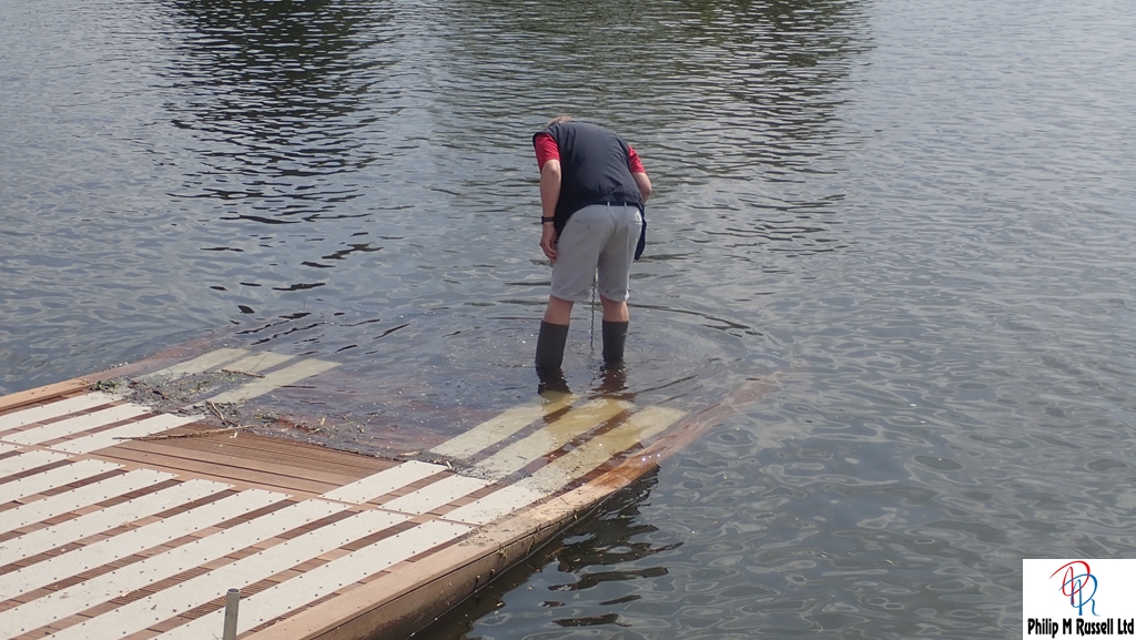 Our illustrious Commodore helped the Rater by drilling a couple of holes in the new Rater pontoon so that it would lower just a bit more to allow the Rater to be recovered. He went down to near wellie depth. He also placed the magnificent boat model “Invader” in the club. It is well worth looking at.