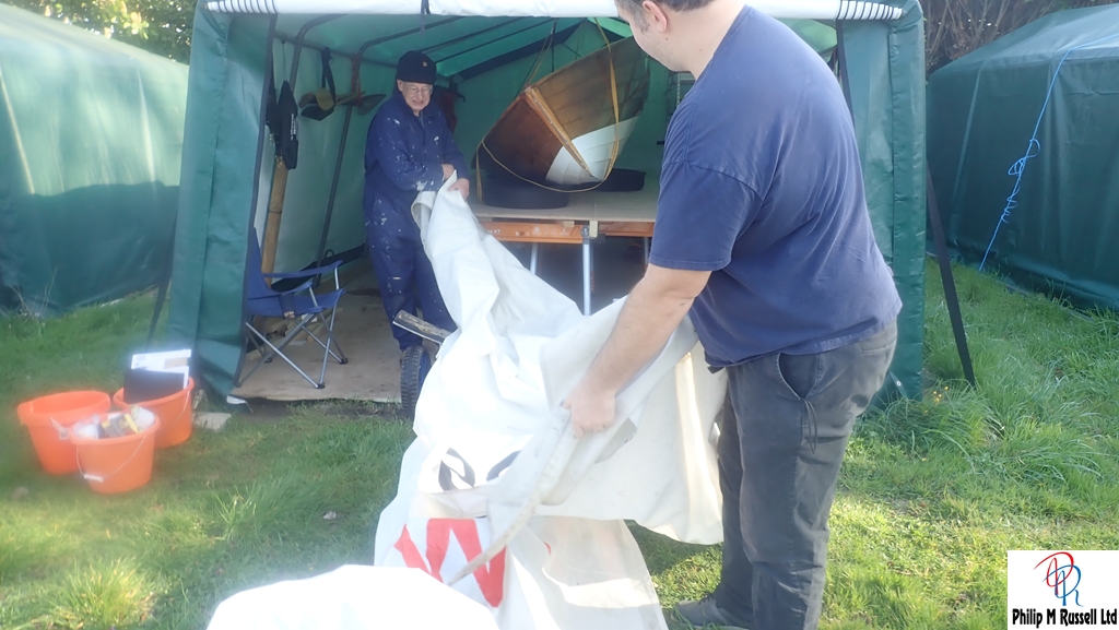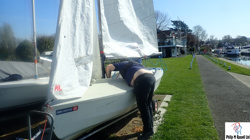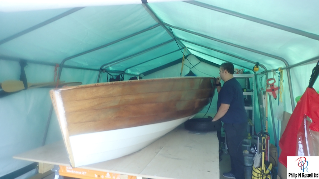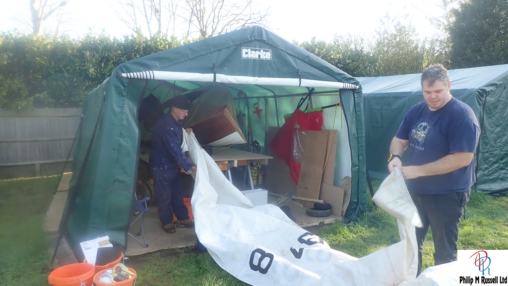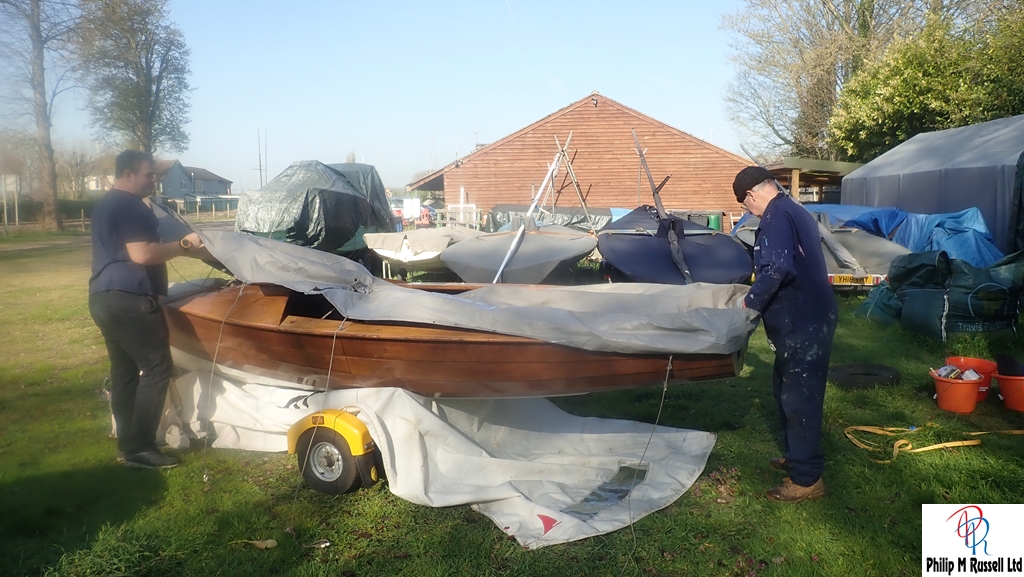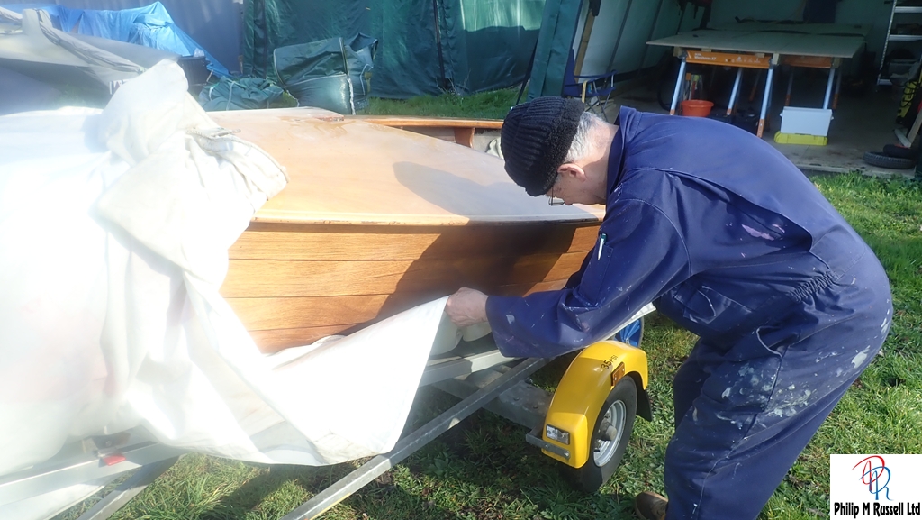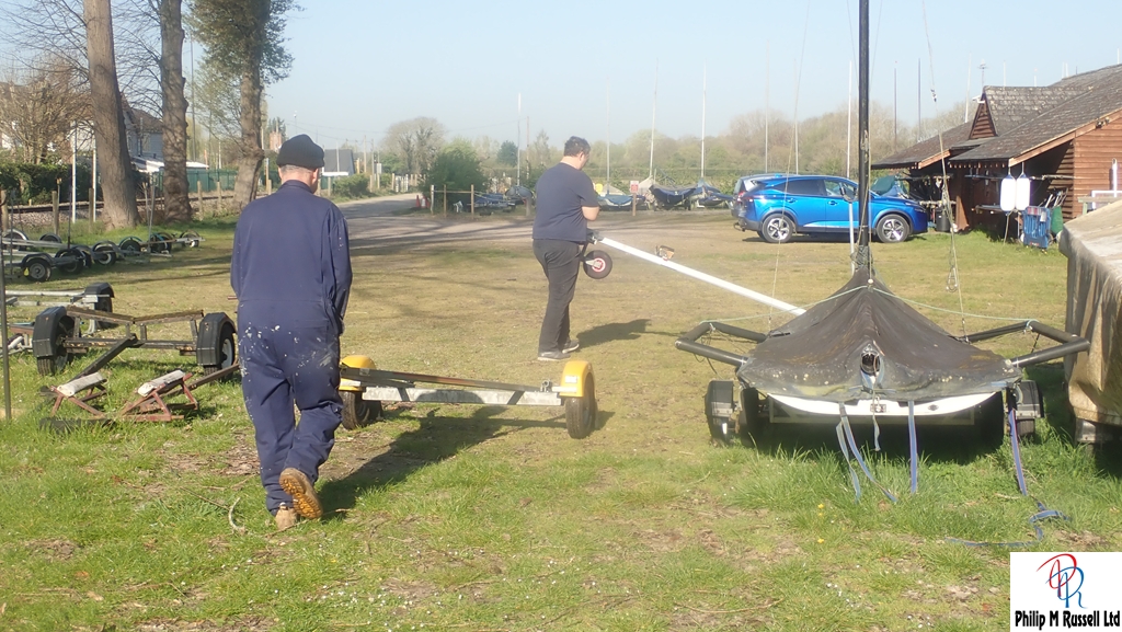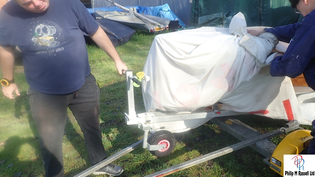 Guy needed help moving Lady Luck, his Merlin Rocket, out of the repair tent and onto a trailer so he could take her off and learn the dark art of varnishing.