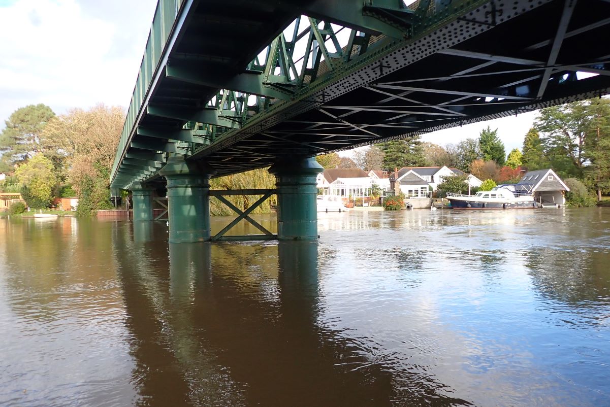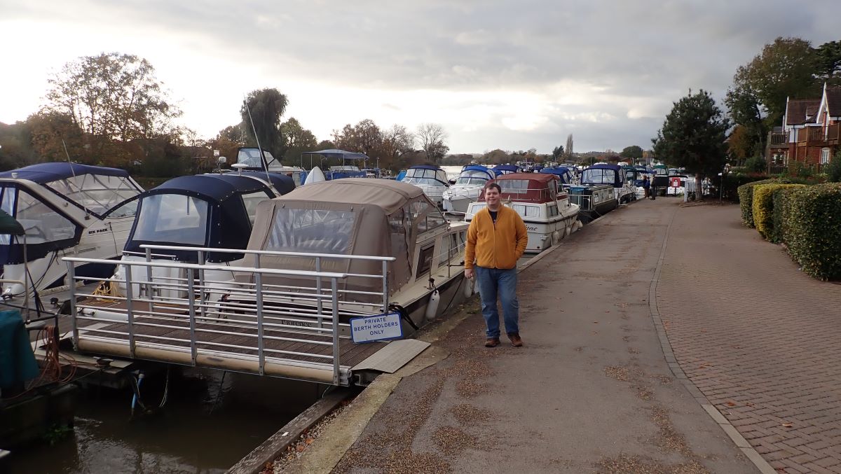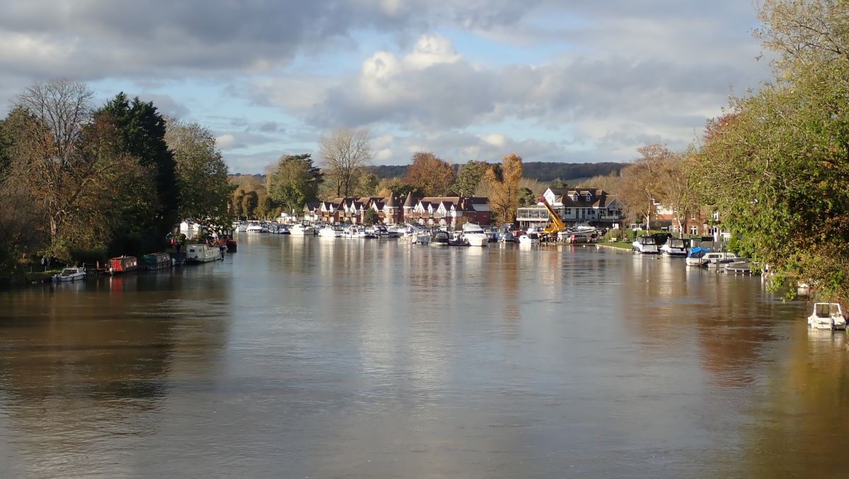 We walked downstream following the river surge towards where Paul and the team nearly had a close encounter with the bridge. We waded down a muddy path from the clubhouse to the HMS Marina, showing off the Duffy Electric Day Boats. From there, it was a very narrow walk past large, expensive houses down to and across the bridge. We wanted to get some photographs of the Marina and a clear view of the river.