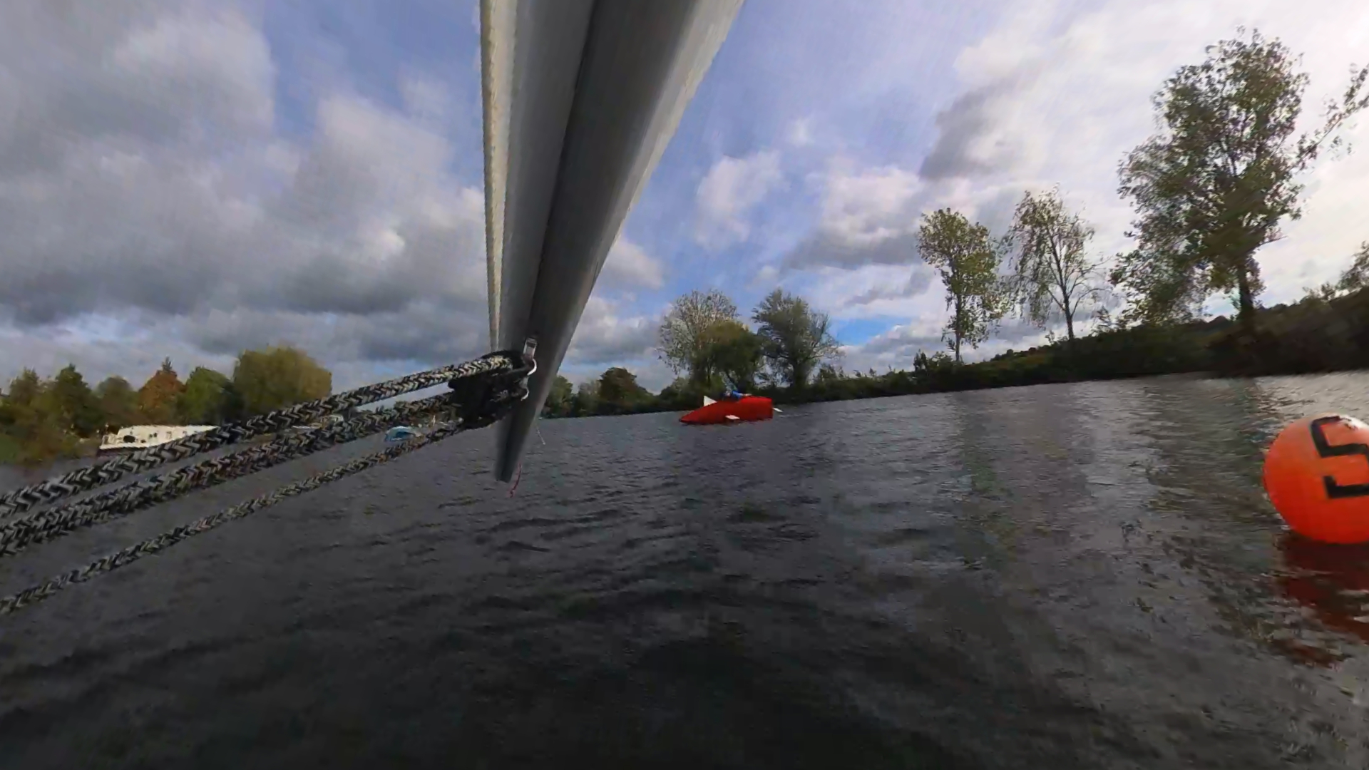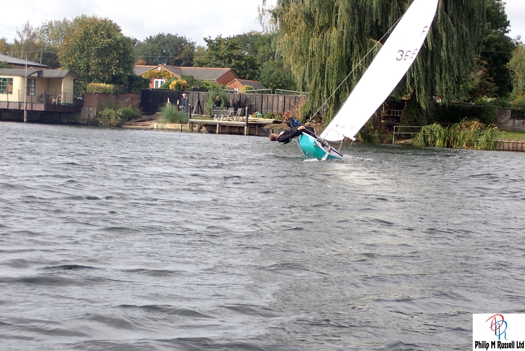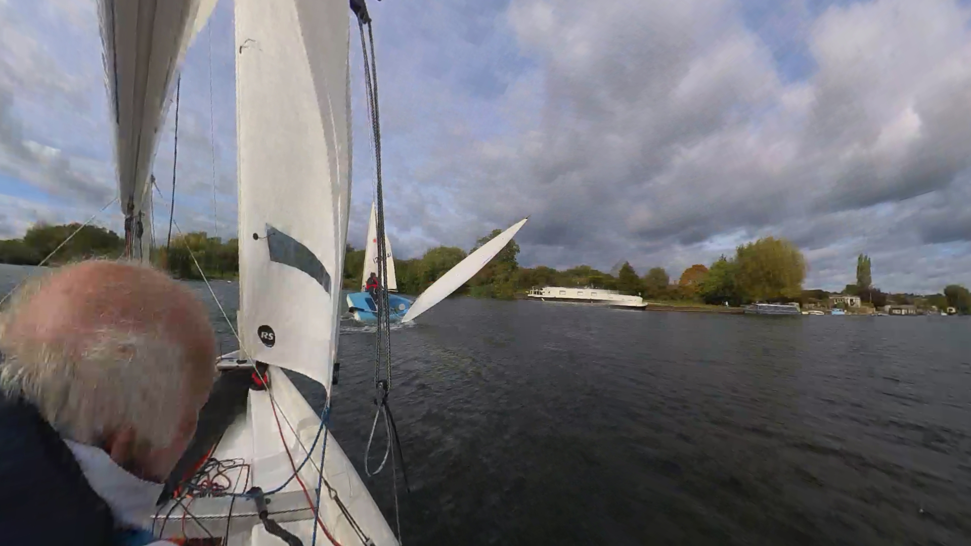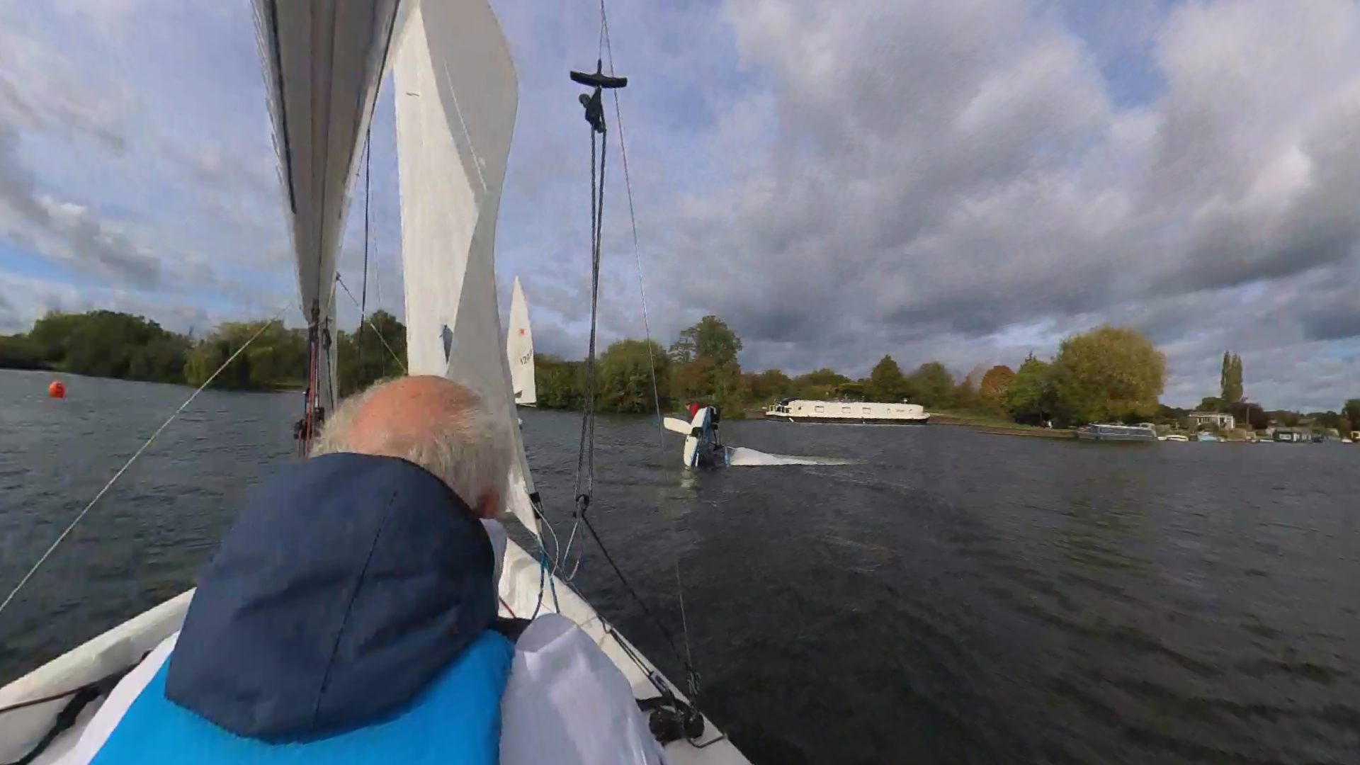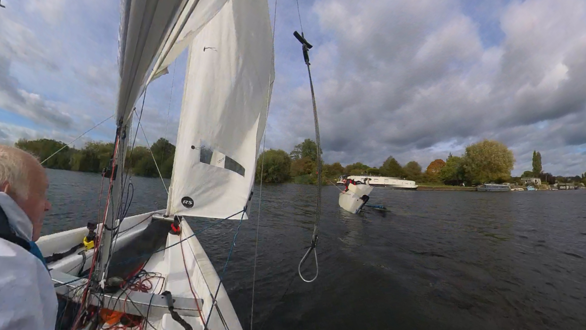 At the top mark, the Lightning capsized, flinging Keira into the river. Almost simultaneously, Ray in the Laser went over too, just metres away.