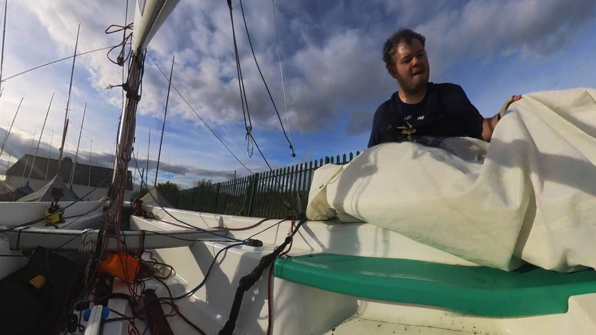 I slipped into the cold water and thick silt, sinking to my knees. Waist-deep, I pushed us free and with little grace I clambered aboard, soaked and muddy. Filling the boat with Muddy water. We limped back across the river only using the jib to the club. As I got out my sallopets were filled with muddy water and as I undid the velcro at the bottom a surge of water rushed out onto the hard.