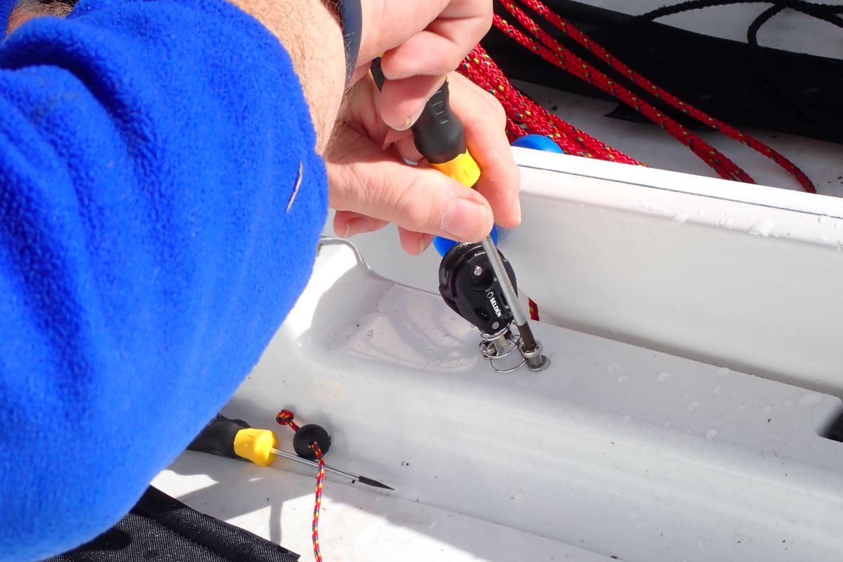 Next on the agenda was the Gennaker sail, a task that proved to be more intricate. Plugs had to be removed, pulleys fitted, and various strange-looking devices installed. While Paul sorted through the fittings, I navigated the interior of the boat. I started removing plugs and trying to reach awkward spaces. A bolt slipped and vanished into the abyss of the centreboard mechanism, a small setback that resulted in a mental note to purchase replacements.