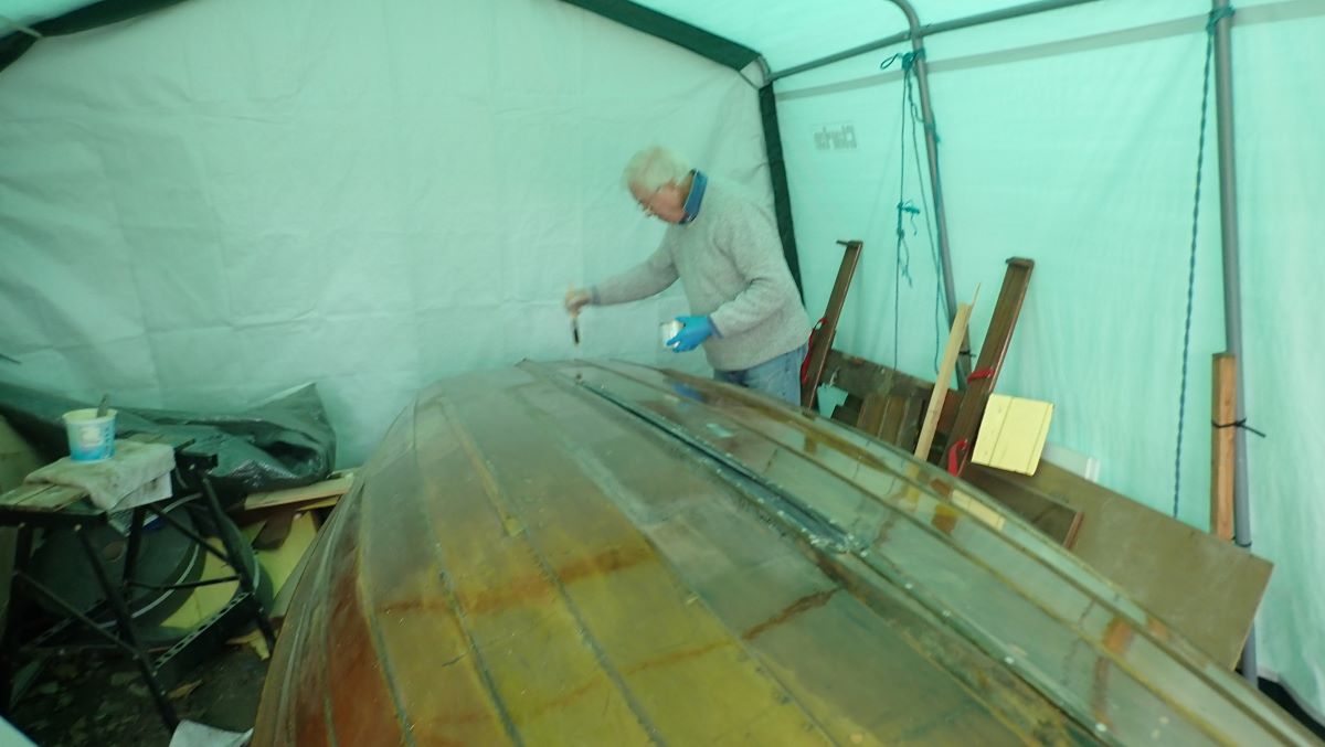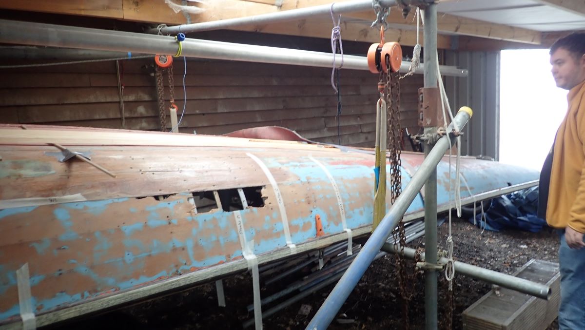 Curiosity led us to a Merlin Rocket, turned upside down, in the midst of restoration. The boat’s mahogany planks gleamed under the twelfth coat of varnish, a testament to the owner’s dedication. He shared with us another project, Dainty Too, a 1920’s A-Rater in dire need of repair. The hull, stripped to bare wood in places and riddled with holes of rotten wood, showcased the extensive work ahead. It would be a year or two before Dainty Too graced the waters again. However, the promise of its future glory was evident.
