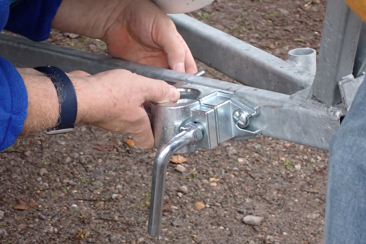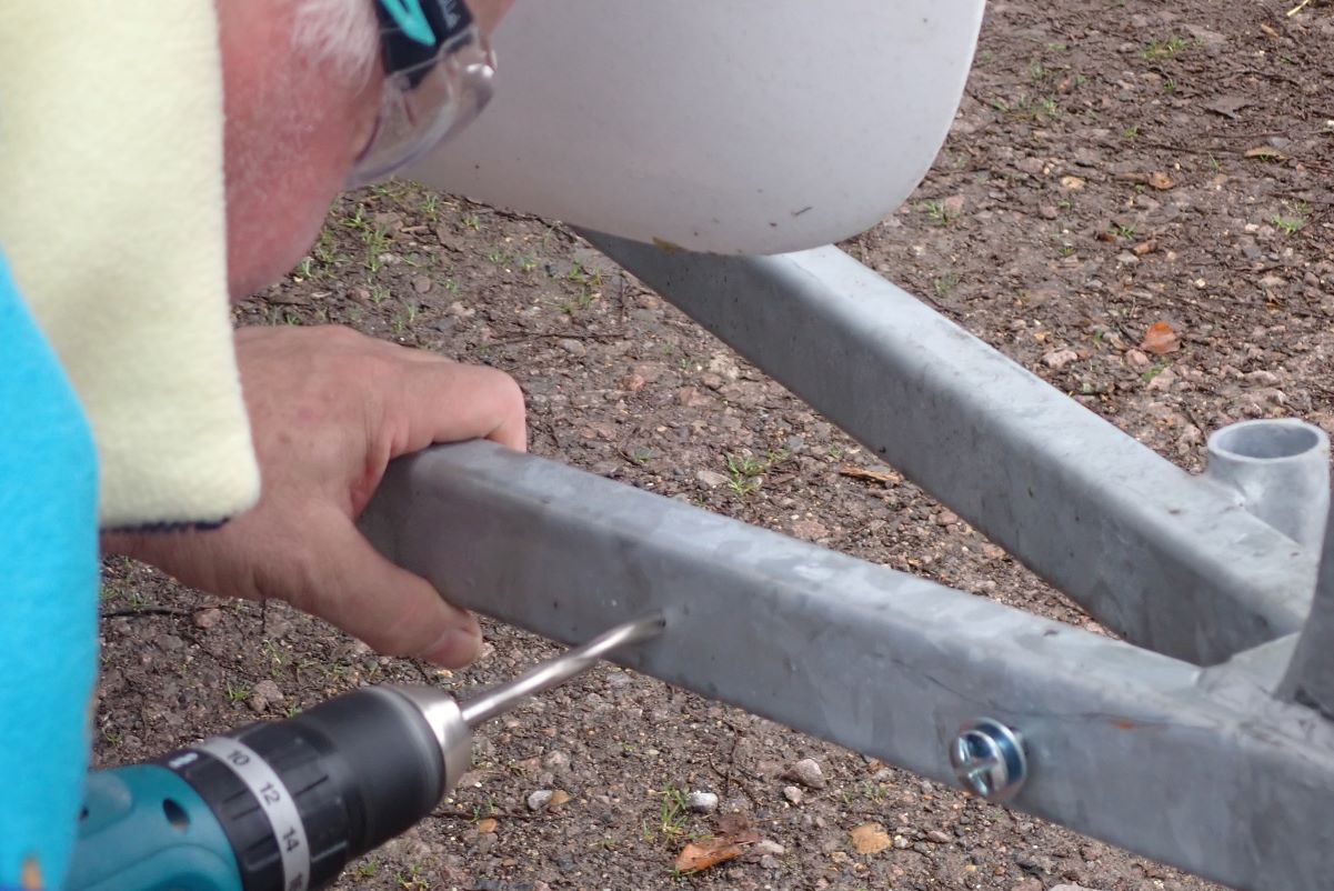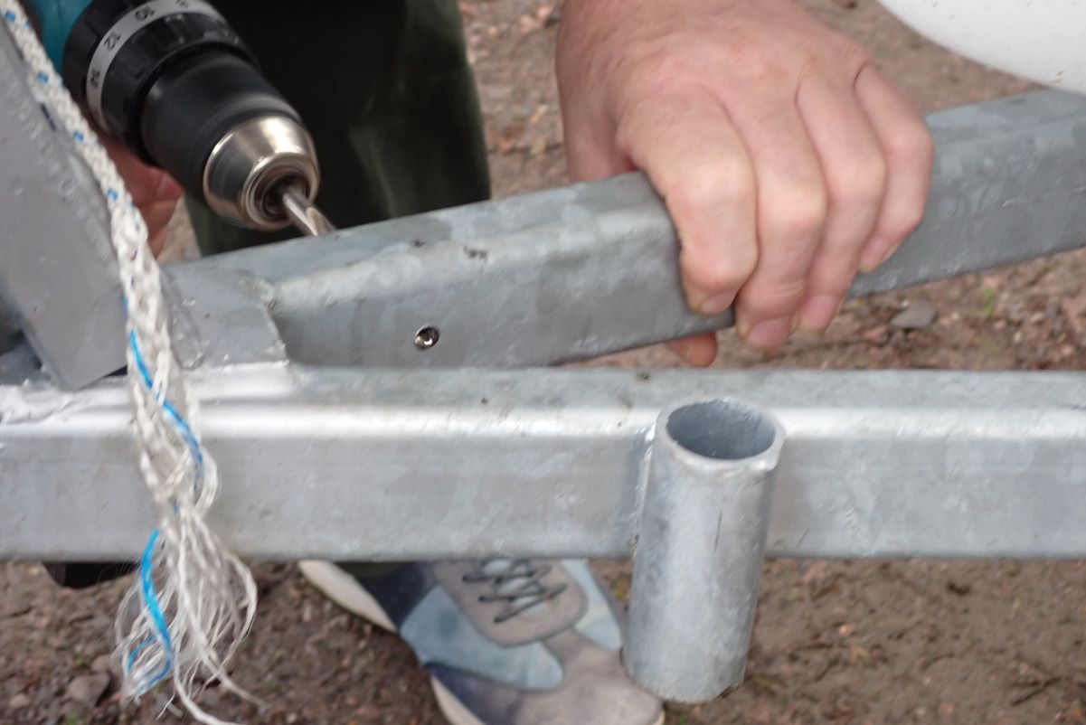 Paul hoisted the boat up on its launch trolley, providing me the perfect opportunity to measure up and drill holes for the jack mount. With a new drill bit and a battery-powered drill, the process was swift and smooth. Soon the jack was installed, allowing the boat to be parked in a high position for effective water runoff.