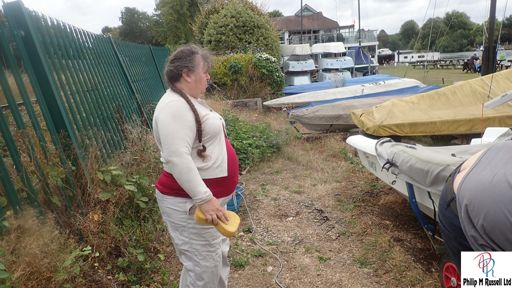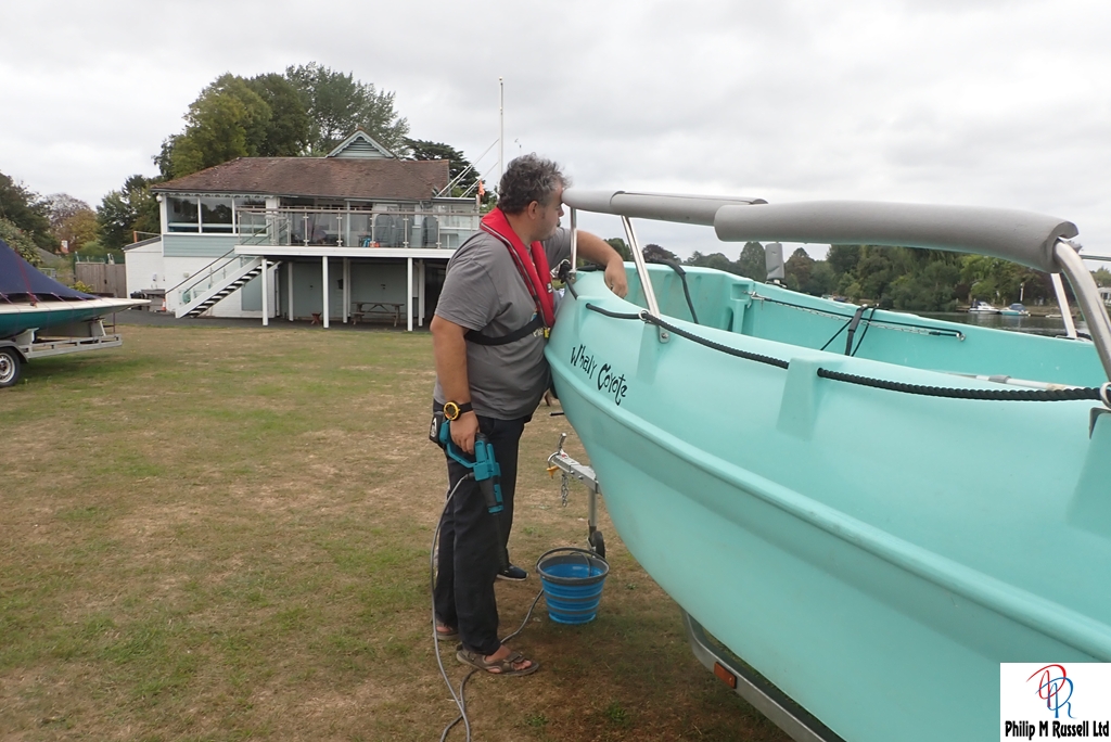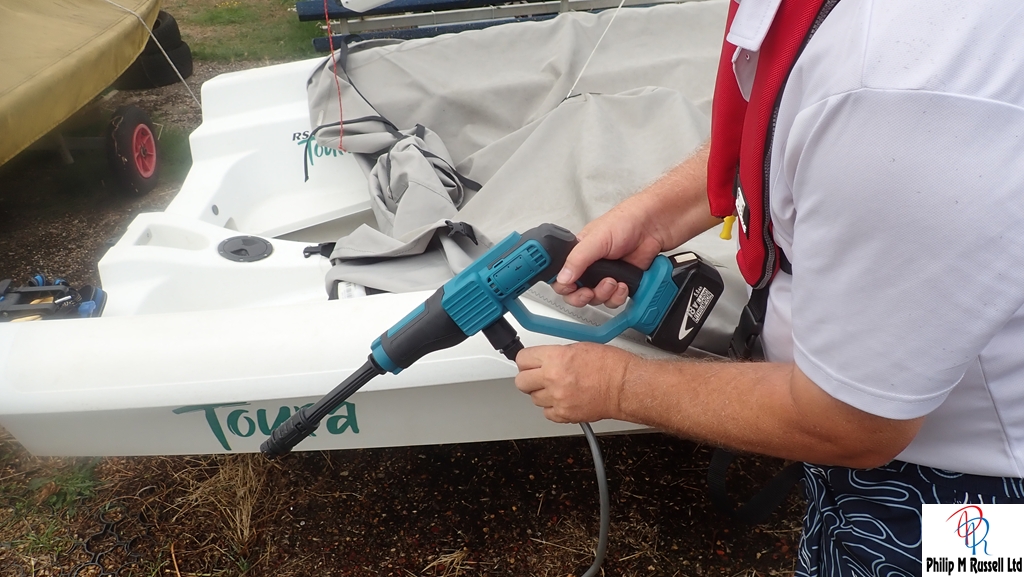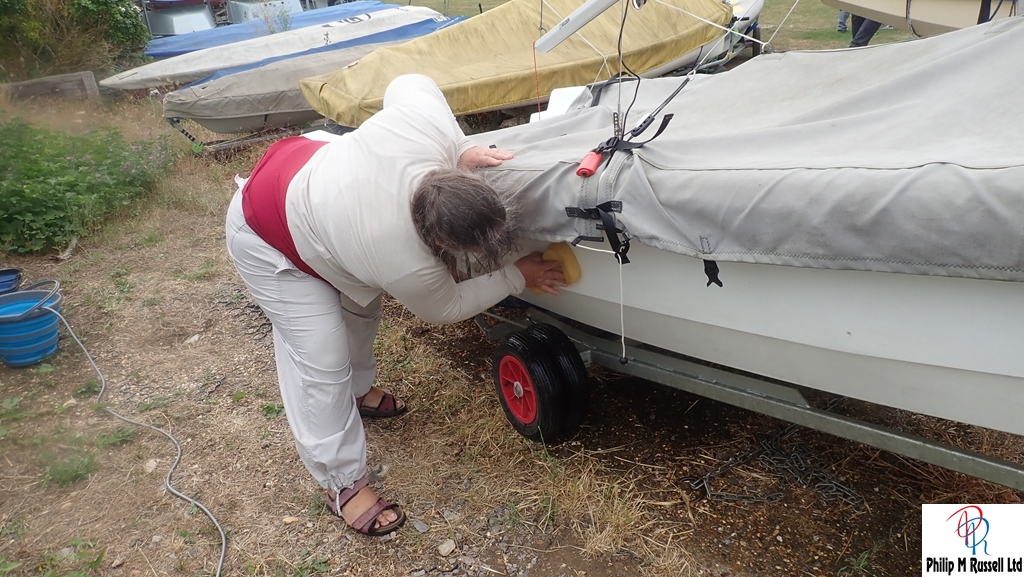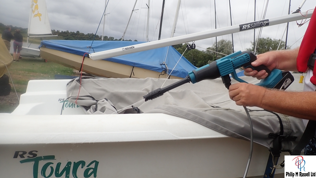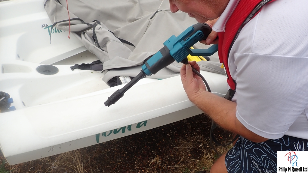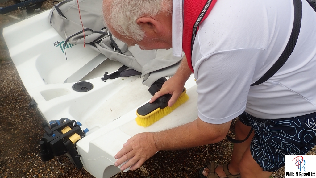 With a nice clean and sparkling RS Toura, we thought that we had better clean the Whaly, so out came the soapy water and the jet washer and a lot of scrubbing. The surface of the Whaly is quite rough so as well as the jet washer we also needed a scrubbing brush and Guy - perhaps feeling that he owed us something for the rescues, came and scrubbed the boat too.