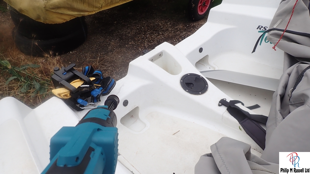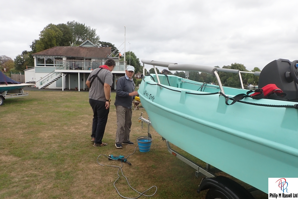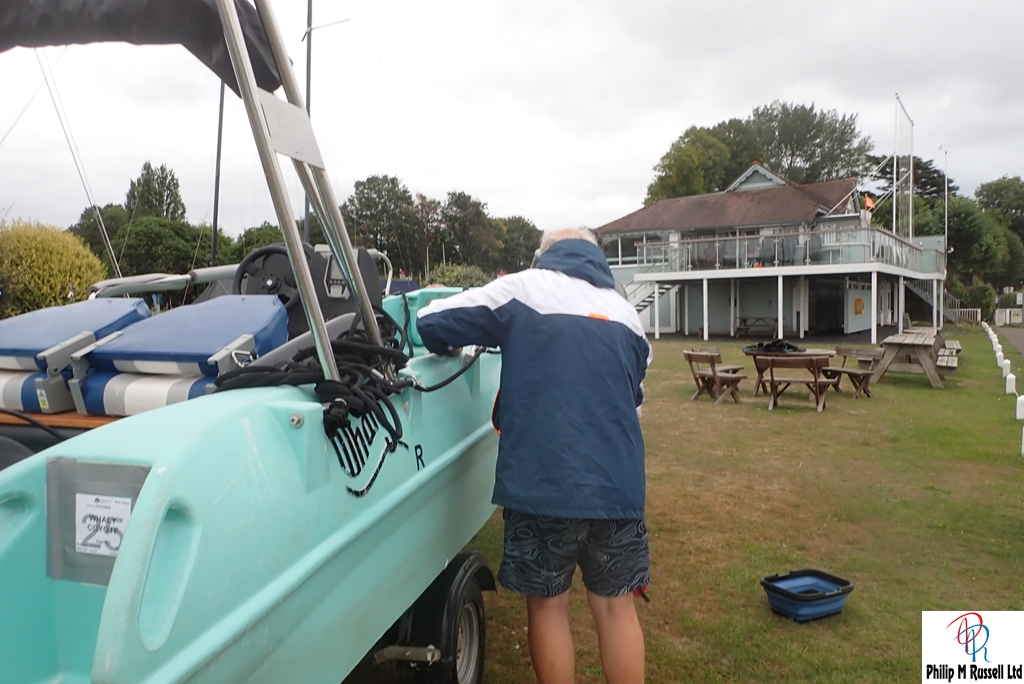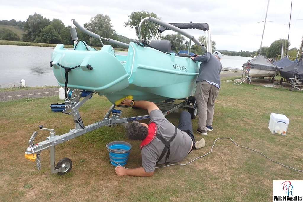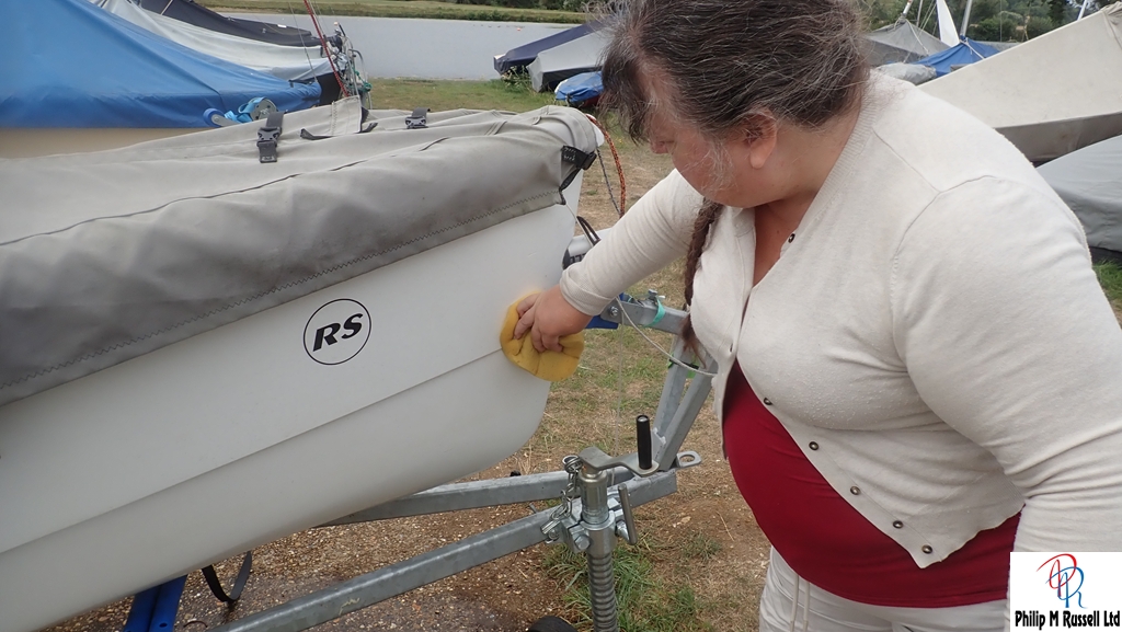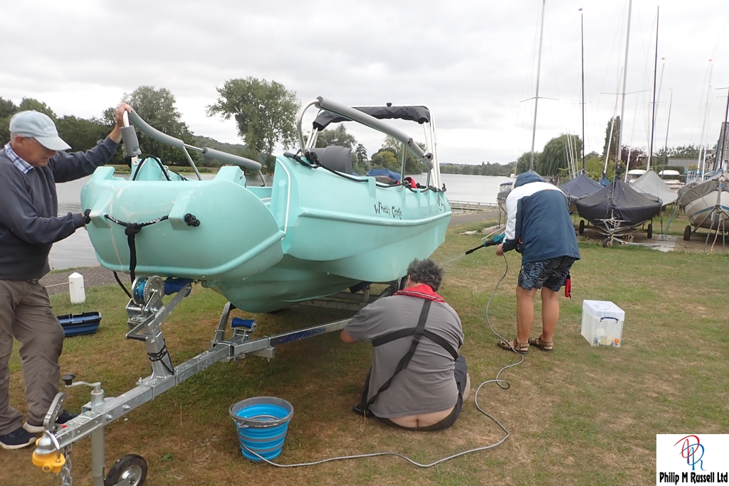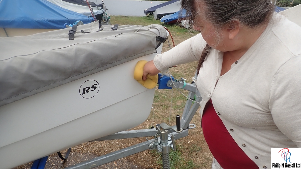 With a nice clean and sparkling RS Toura, we thought that we had better clean the Whaly, so out came the soapy water and the jet washer and a lot of scrubbing. The surface of the Whaly is quite rough so as well as the jet washer we also needed a scrubbing brush and Guy - perhaps feeling that he owed us something for the rescues, came and scrubbed the boat too.