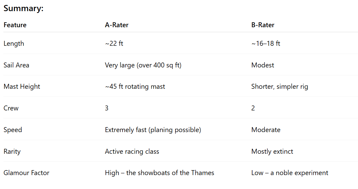 The Thames A-Rater and B-Rater are both historic sailing dinghies associated with the River Thames, especially in places like Upper Thames Sailing Club and Thames Sailing Club. However, the A-Rater is the far more prominent and well-known class — the B-Rater was a short-lived experiment that didn’t catch on in the same way.