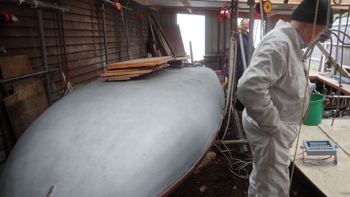 Dainty Too is at the Upper Thames Sailing Club and is being restored by Chris Day. All the holes have been repaired with new wood being scarfed in. The bottom is now virtually complete.
