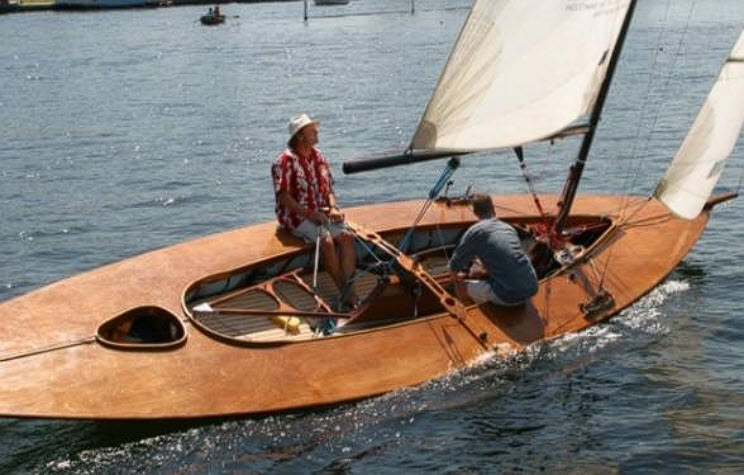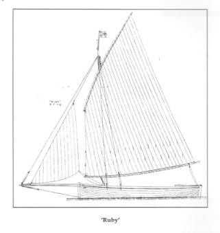 The lower image highlights a further modification to her bow, designed to increase her effective waterline length when heeled over. From her modest beginnings at 18 feet, Ruby evolved into a sleek 28-foot 6-inch racer, with an additional 4-foot bowsprit.