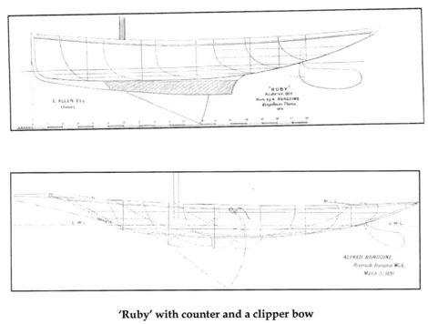 The earliest of the Thames Raters included boats like Ruby, shown here in her original 1870 design. By 1888, she had undergone a significant transformation: an extended stern added six feet to her length, as illustrated in the second drawing.
