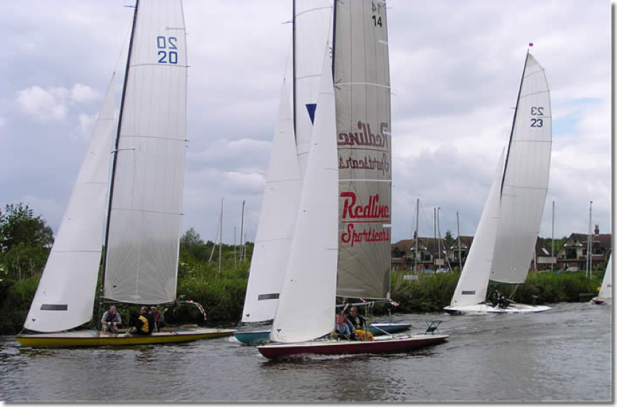 Thames A-Raters racing on a narrow river course (Horning Three Rivers Race). Their towering rigs capture wind above the trees, while crew hike out to balance the immense sail force. The class’s elegant lines and speed continue to awe spectators, just as they did in Edwardian times.thedailysail.com thamessailingclub.co.uk