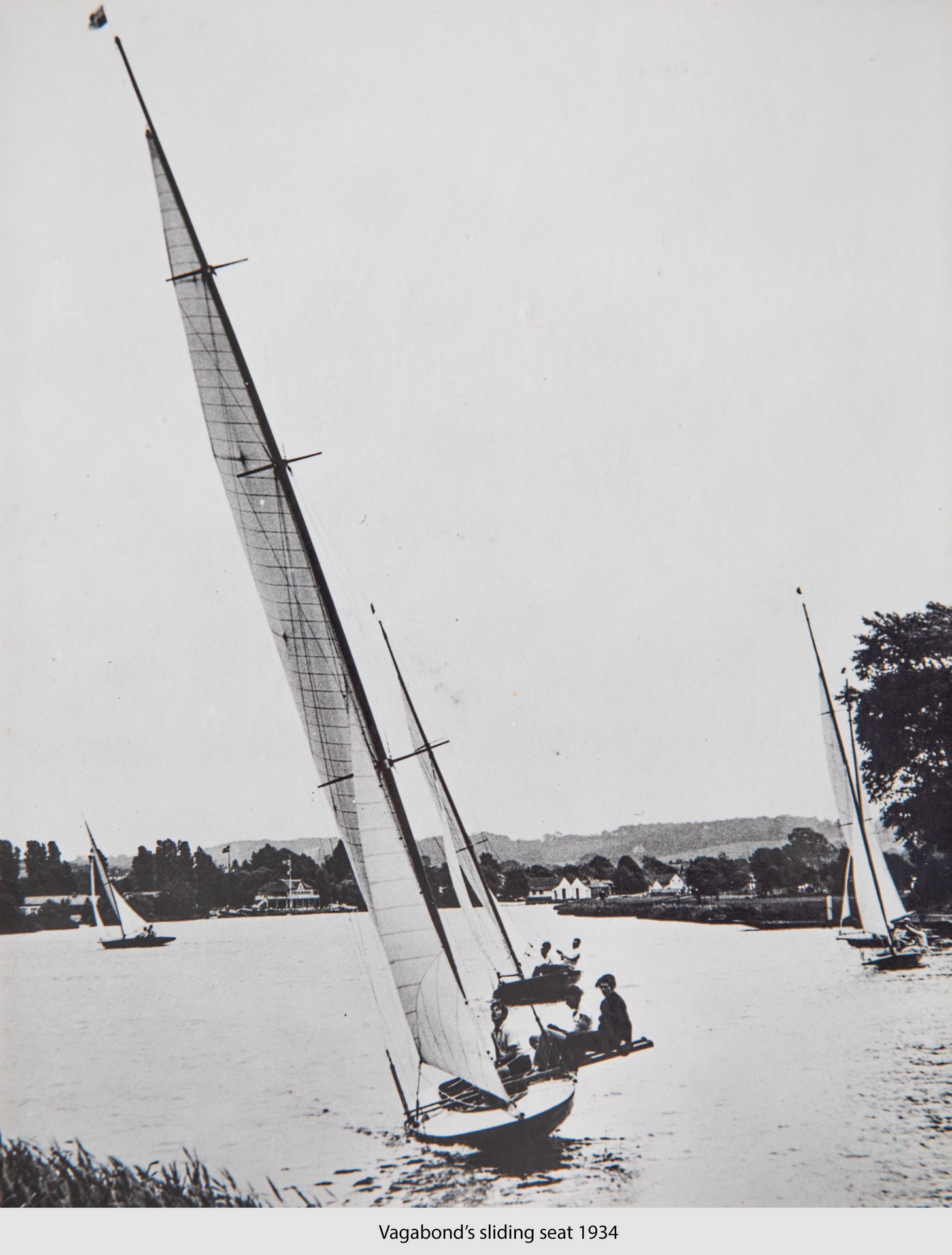 Perhaps the most remarkable innovations came in the 1930s, as the class sought ways to carry those huge sails in stronger winds. Beecher Moore, an American-born dinghy champion in Britain, purchased the aging Vagabond in 1934 and set about turbo-charging herthames-sailingclub-history.thecomputerguy-it.co.uk thamessailingclub.co.uk. He and his crew (including the young Peter Scott, who would later become an America’s Cup sailor and famed conservationist) tried something radical: they rigged a trapeze for the crew to hike out. This crude harness – basically a wire to the mast with a rope “handle” and big knots to grab, nicknamed the “bell rope” – allowed a crew member to hang bodily over the side, counterbalancing the heeling force of the sailsthamessailingclub.co.uk thamessailingclub.co.uk. As Beecher Moore recalled: “I used a loose wire which went to the hounds (masthead)… with big knots in it… Bill Milestone was my first crew to hang out on this… it gave us great success.”thamessailingclub.co.uk thamessailingclub.co.uk It was the birth of the trapeze in dinghy sailing – years before the device was (briefly) adopted and banned in the International 14 class in 1938. In fact, Peter Scott, while crewing on Vagabond, improved the idea by adding a proper harness for safety, and with that he and John Winter won the 1938 Prince of Wales Cup (the 14’ dinghy championship), heralding the trapeze’s potentialthamessailingclub.co.uk. Not to be outdone, Moore also fitted sliding seats on Vagabond – up to three planks that could extend out each side, allowing all crew to hike far outboard (an idea borrowed from sailing canoes)thamessailingclub.co.uk thamessailingclub.co.uk. This made Vagabond of the ’30s a floating laboratory for dinghy performance. Thanks to these measures, her 45′ mast could be carried even in strong winds, and she became nearly unbeatable in her revived career. These innovations, though not immediately universally copied, cemented the A-Raters’ reputation as trend-setters. Many features of modern high-performance dinghies – trapezes, hiking racks, light hulls with big sail area – were pioneered on the Thames long before they spread to the wider sailing world.