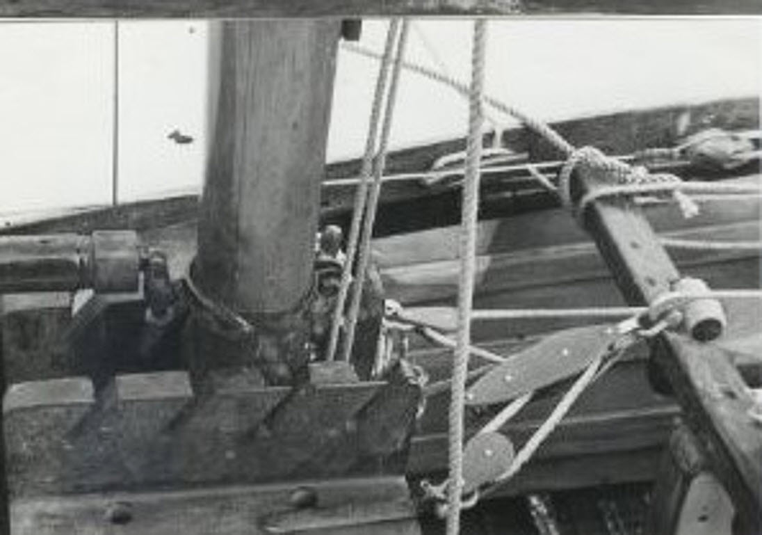In the image, you can see the distinctive slots designed to receive a pin that passed through the mast, allowing it to pivot. The mast itself extended down to, or very close to, the hog (the internal keel). This setup meant that when raising or lowering the mast, the base remained securely hinged—thanks to the structure known as the tabernacle, formed by the two upright pieces either side of the mast.