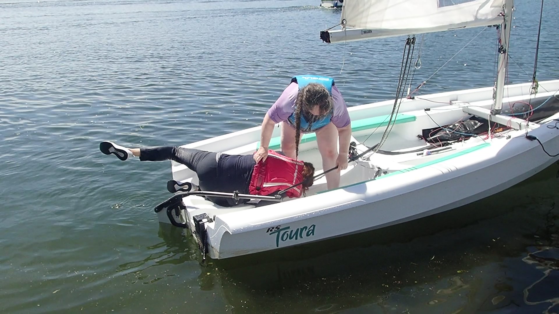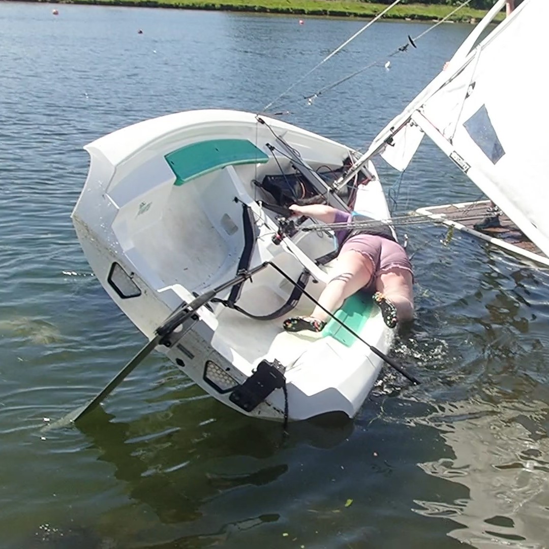 Now, this is where I struggled. The trick is to stay balanced on the centreboard, using your weight without going full “koala bear wrapped around a tree” like I did. With a bit of practice (and fewer desperate hugs), it’s possible to turn that centreboard into your best friend, using it to coax the boat back onto its feet. It was only when my boat capsized that I noticed underneath there were two handle to grab hold of to lift yourself out of the water and onto the centreboard. Crew on the other side can throw a rope over that can sometimes help