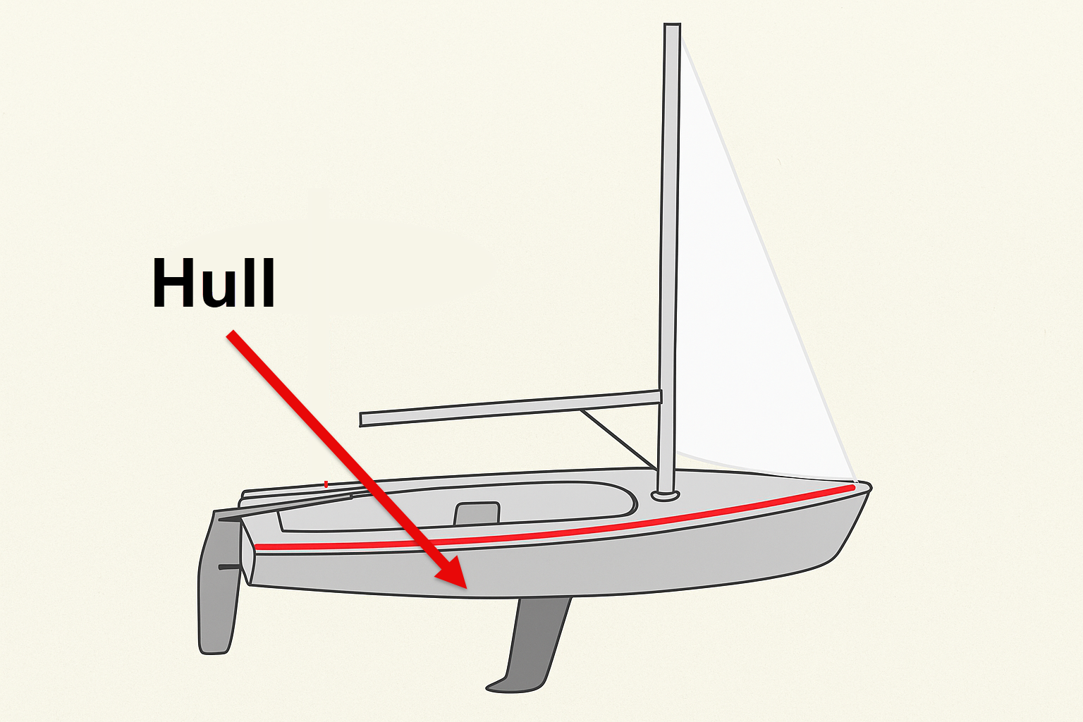 Image Description: Diagram of a sailboat highlighting the hull, with labels indicating the different parts such as the bow, stern, and keel.