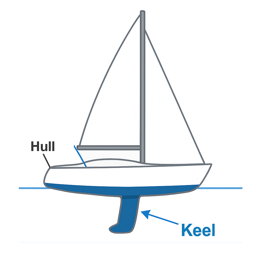 Image Description: Diagram of a sailboat showing the keel, with labels indicating its position and function.