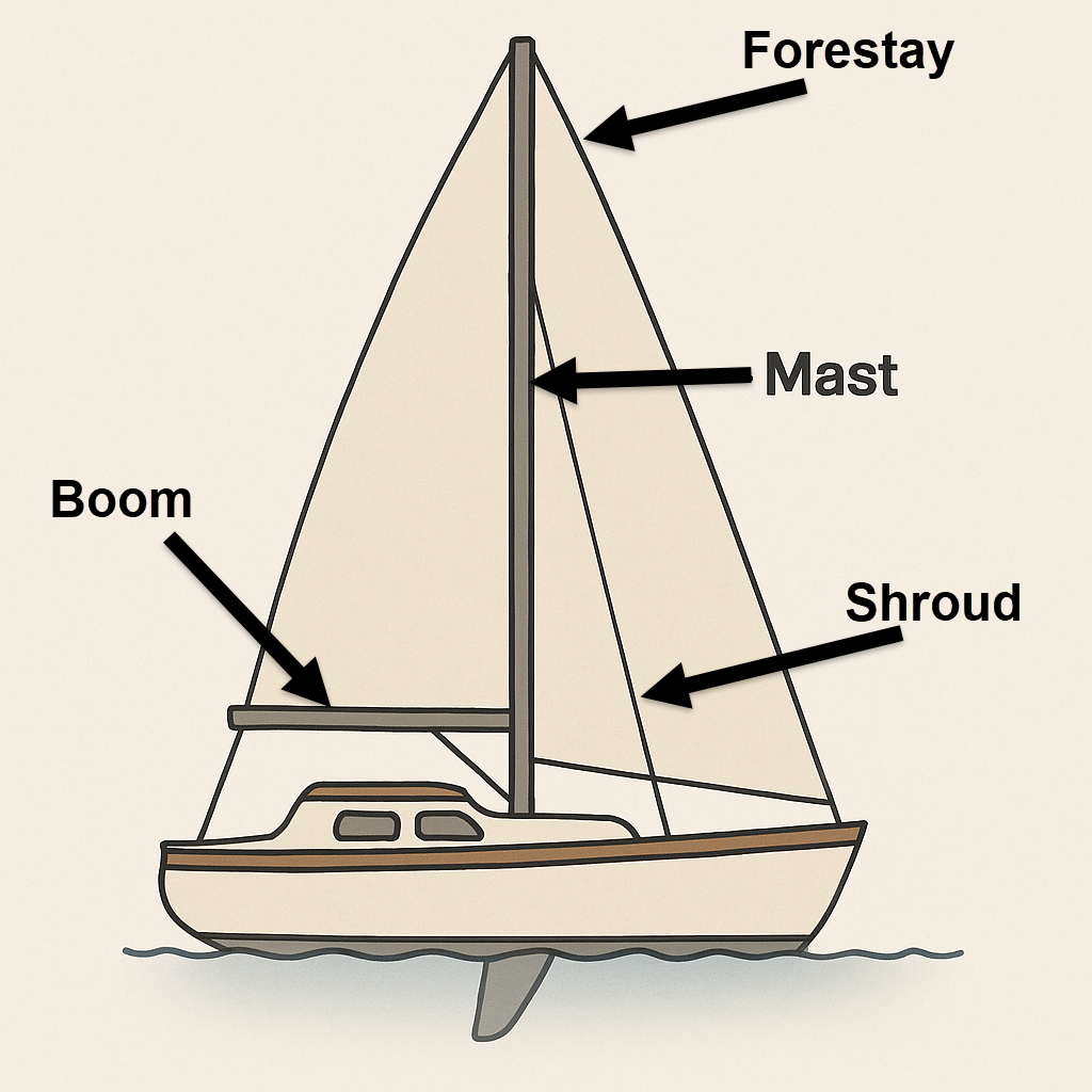 The mast supports the mainsail and often the forestay, which holds the jib or genoa. Its height allows for a larger sail area, which can catch more wind.