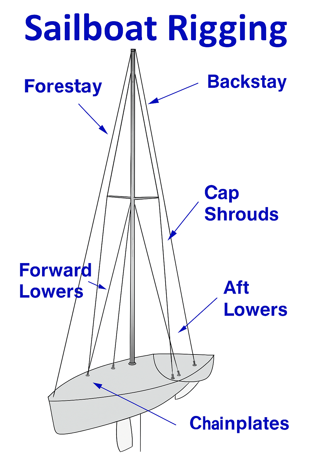 Image Description: Diagram of a sailboat showing the rigging system, with labels for standing rigging components like shrouds and stays, and running rigging components like halyards and sheets.