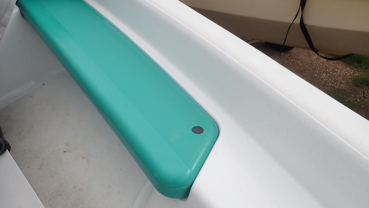 A bench seat that spans the width of a small boat, providing both seating and structural support.
